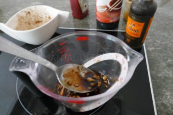 Marinade: 15 cl sauce soja, 2 cuil. à s. de miel, 1 cuil. à s. de sauce Worcestershire , 1 cuil à s. de Ketchup, jus d’un citron, 2 gousses d’ail, poudre de piment