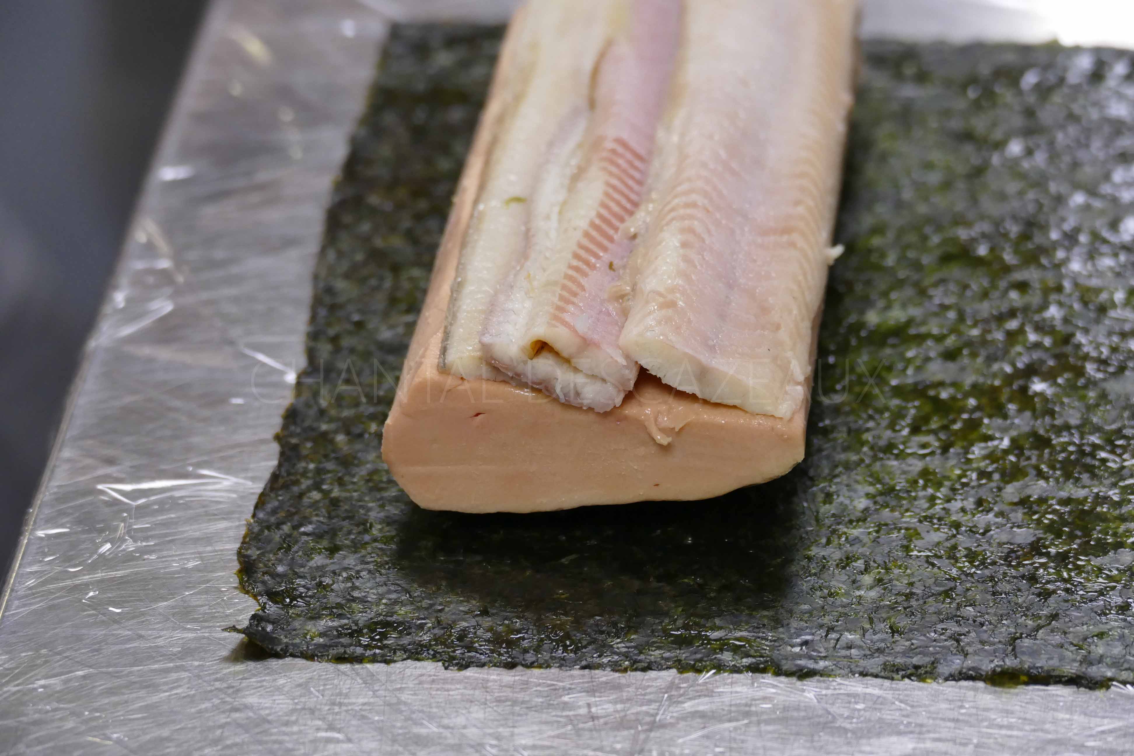 Faire le montage de la ballotine en superposant foie gras, filets d’anguille fumés et cabillaud. Envelopper dans la feuille de nori et enrouler en serrant bien pour donner la forme d’un ballotin. Poursuivre avec une 2ème feuille de Nori mouillée en serrant toujours et éventuellement une 3ème feuille.