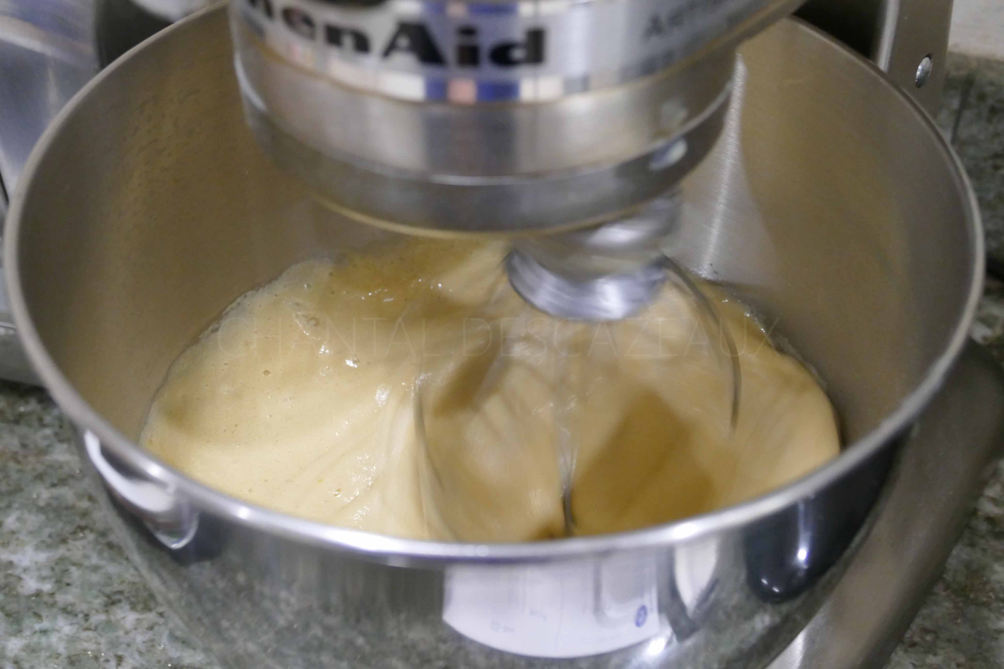 Faire blanchir les œufs entiers et les sucres en fouettant vivement pendant 5 minutes. Ajouter la crème, le beurre fondu, puis la farine et la levure mélangées.