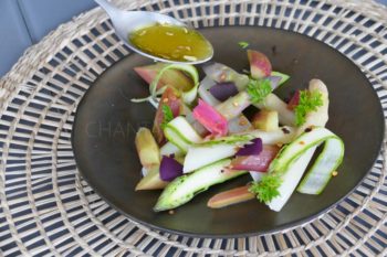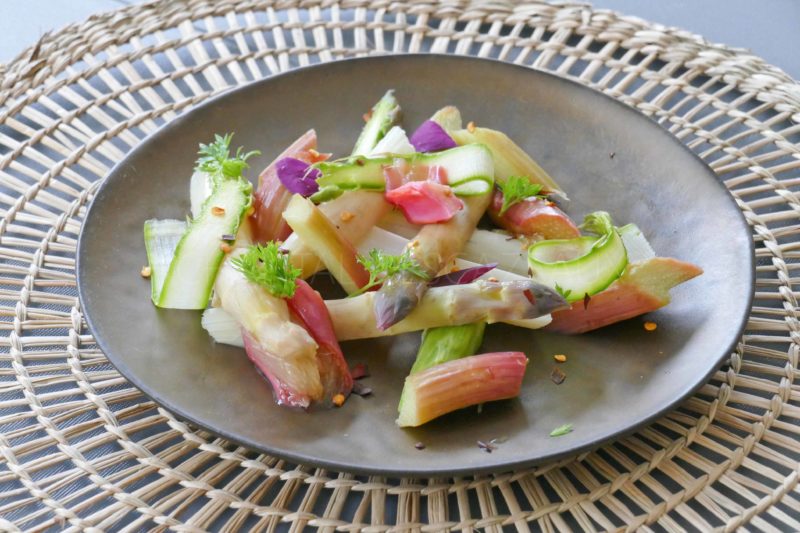 Asperges et rhubarbe en salade, vinaigrette à l’orange