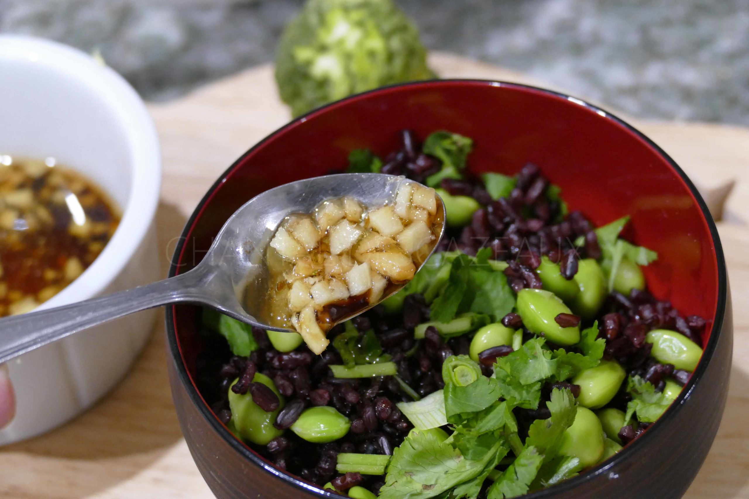 150 g de riz noir Vénéré, 200 g d’edamame, 3 cuil. à s. de sauce soja, 1 cuil. à s. de vinaigre de riz, 1 cuil. à s. d’huile de sésame, 1 cuil. à s. de jus de yuzu ou de cumbava ou de citron vert, 1 cuil. à c. de graines de sésame, 3 brins de coriandre, 1 ciboule (ou de la ciboulette), 1 cm de gingembre frais.