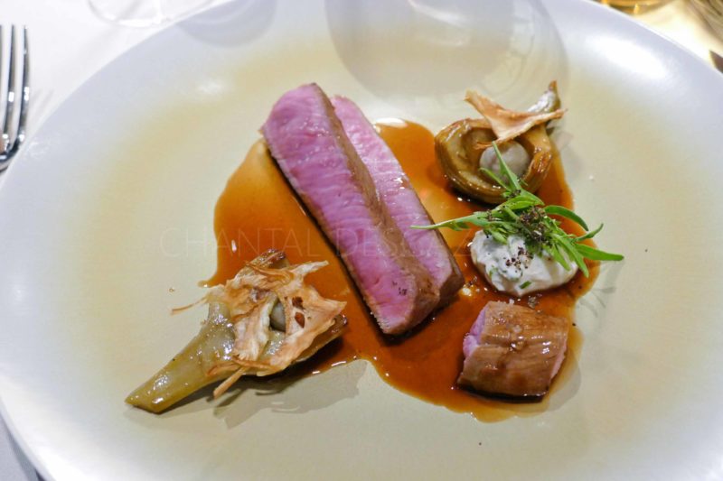 Agneau – selle et filet – artichauts, jus barigoule, chips d’artichauts, fromage frais travaillé, jus d’agneau