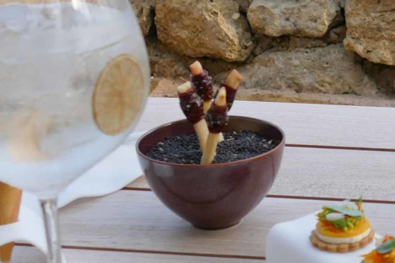 Le cornet : tartare de mulet, graines de quinoa soufflées sur le dessus // Sablé crème raifort, jaune d’oeuf confit et herbes du potager // Charcuterie de pigeon et pain soufflé tel un gressin