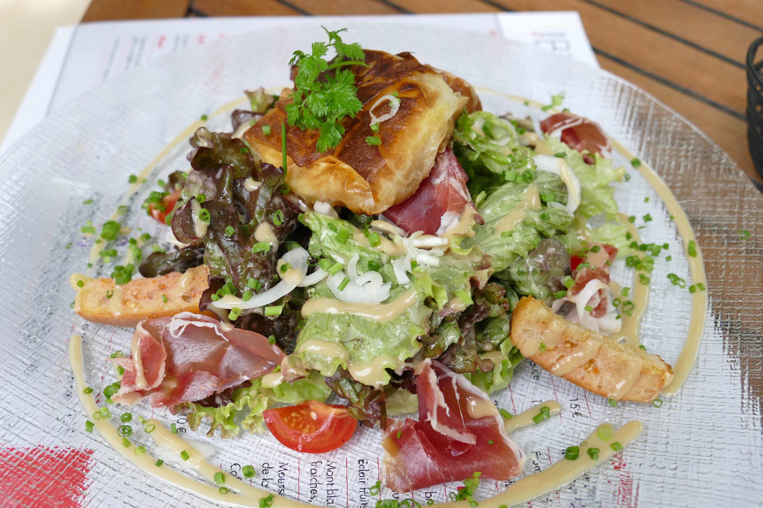 Dans cette salade on trouve un jambon local, rare et d’une qualité exceptionnelle, le Mangalitza de Christophe Guèze, et un croustillant de chèvre chaud de la chèvrerie Baline.