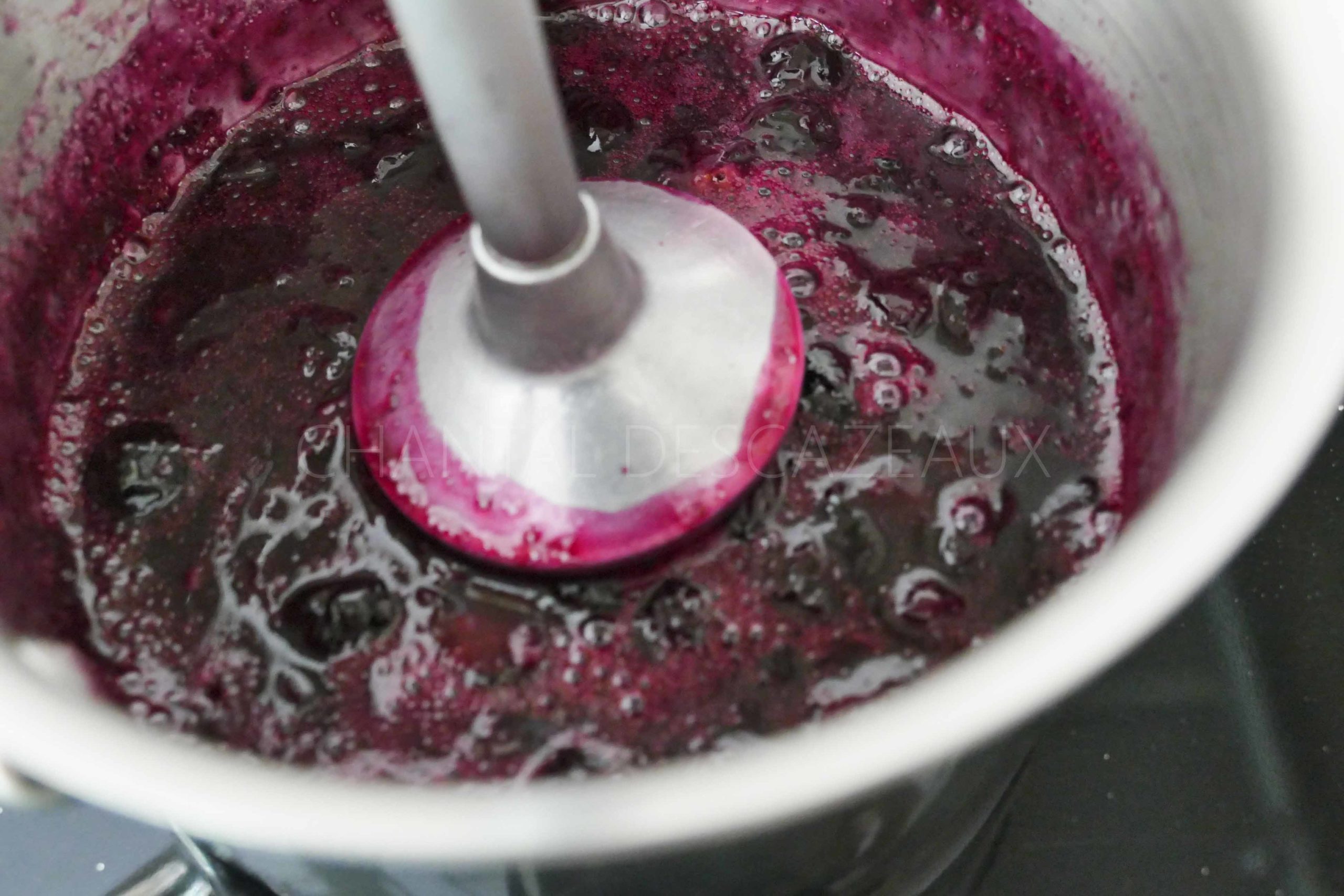 Ajouter le mélange sucre + pectine, donner un coup d’ébullition et mixer grossièrement pour garder de la pulpe. Réserver.