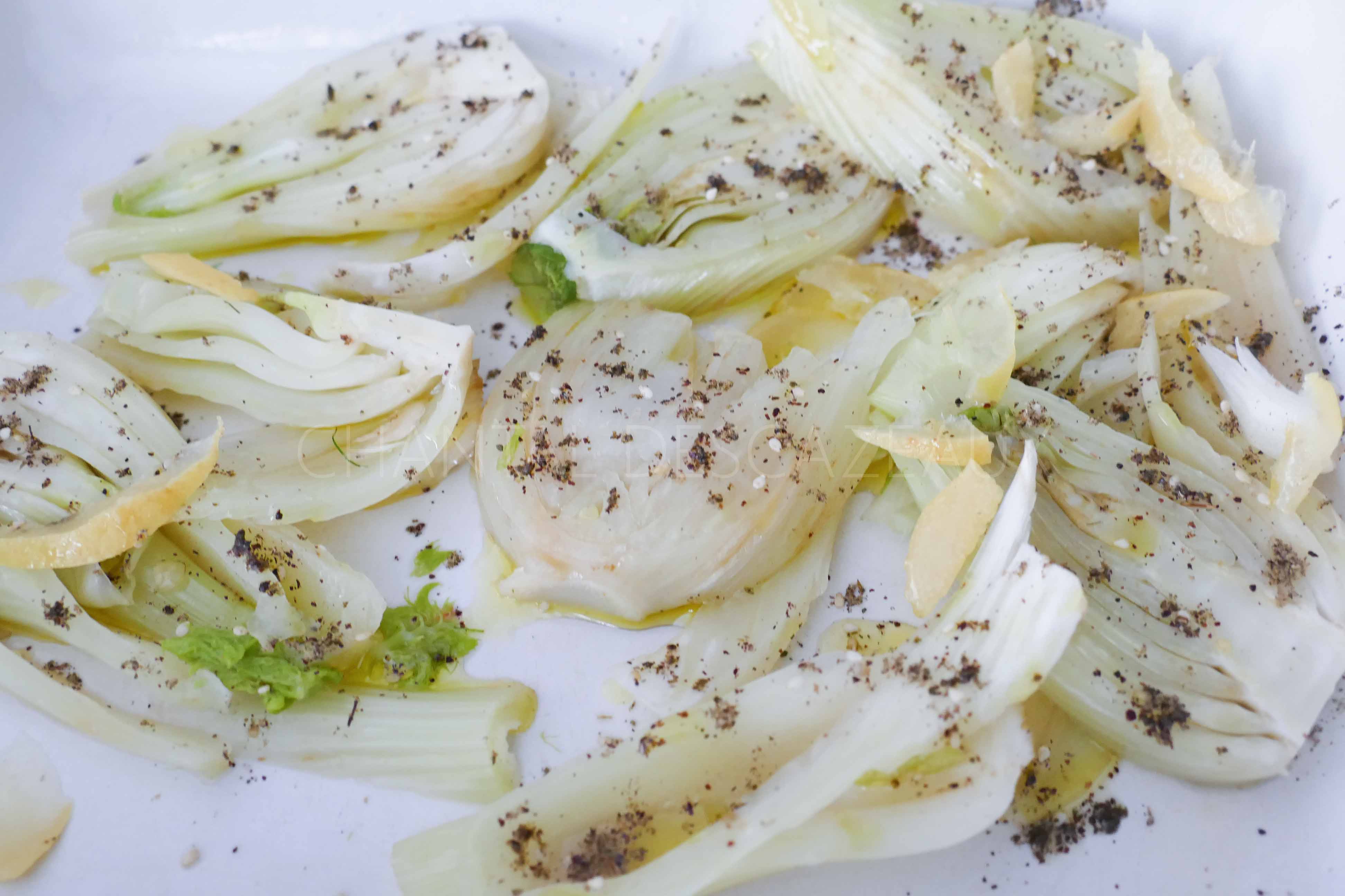 2 bulbes de fenouil, huile d’olive, 1 cuil à c. de zaatar, 1/4 de citron confit, jus d’1/2 citron, 1/4 d’orange, 2 cuil à s. de pignons de pin, myrtilles QS, copeaux de Parmesan, fleur de sel