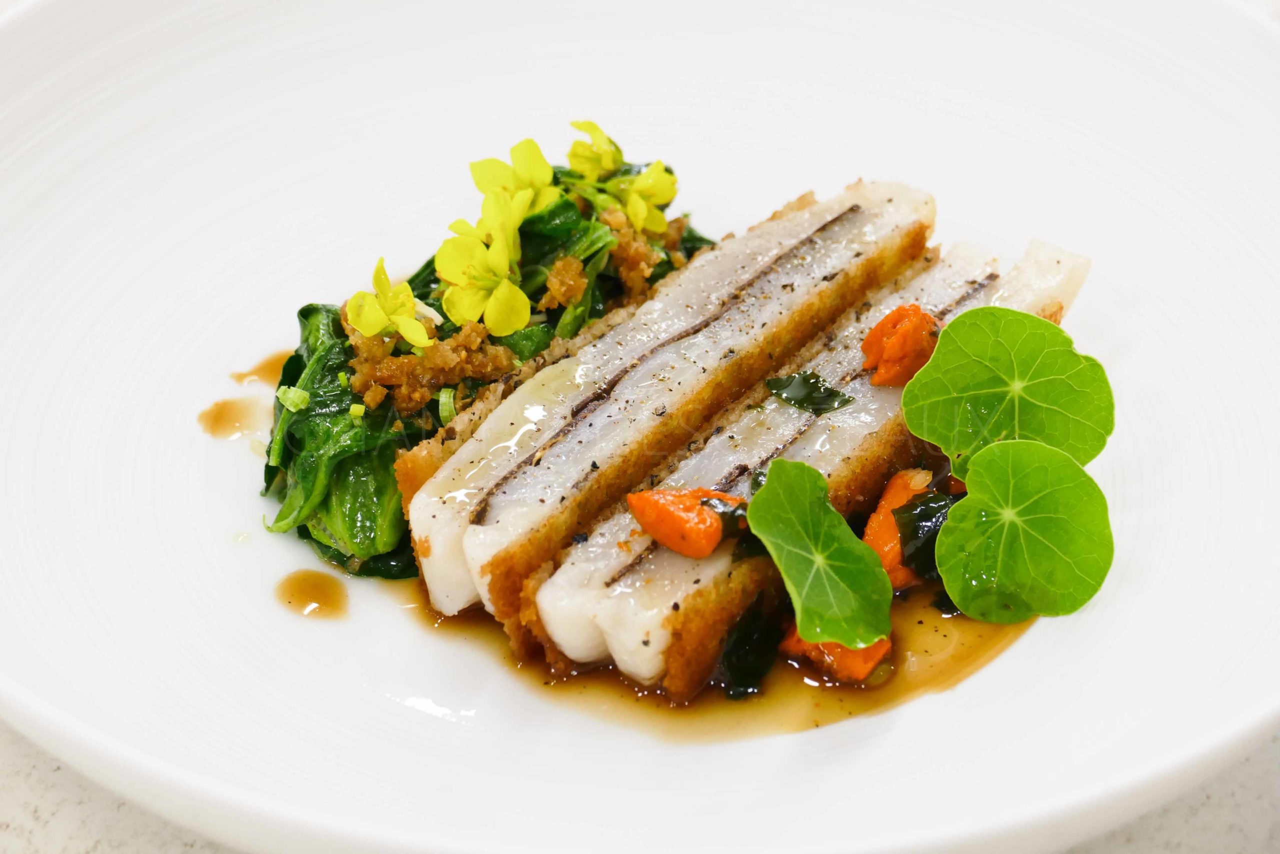 Verser une cuillerée de jus de poulet aux saveurs marines et agrémenté du corail.