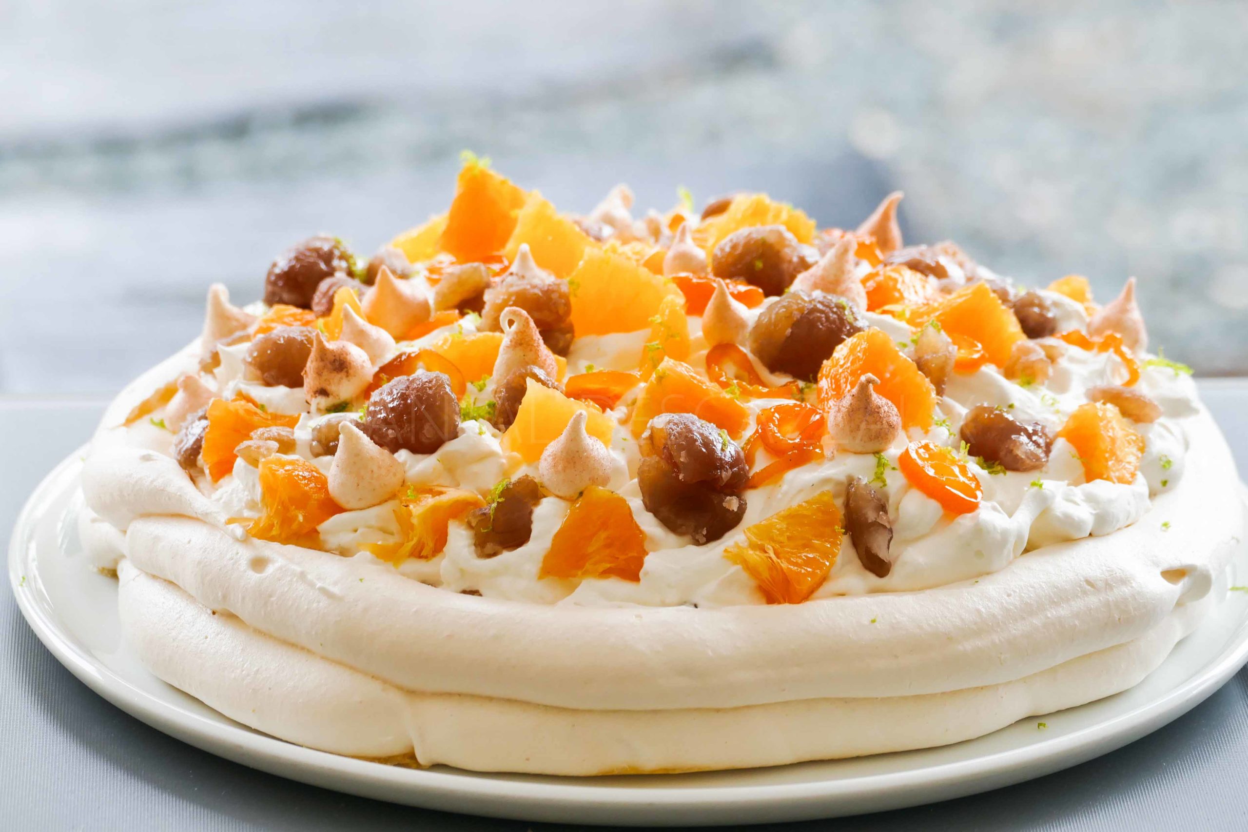 Pavlova marrons oranges et kumquats pour une version hivernale