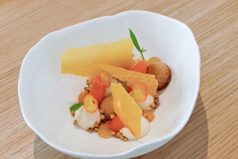 Kumquat confit et en tuile croustillante, financier et crémeux sarrasin, touche d’oseille, très bon dessert, délicat et parfumé.