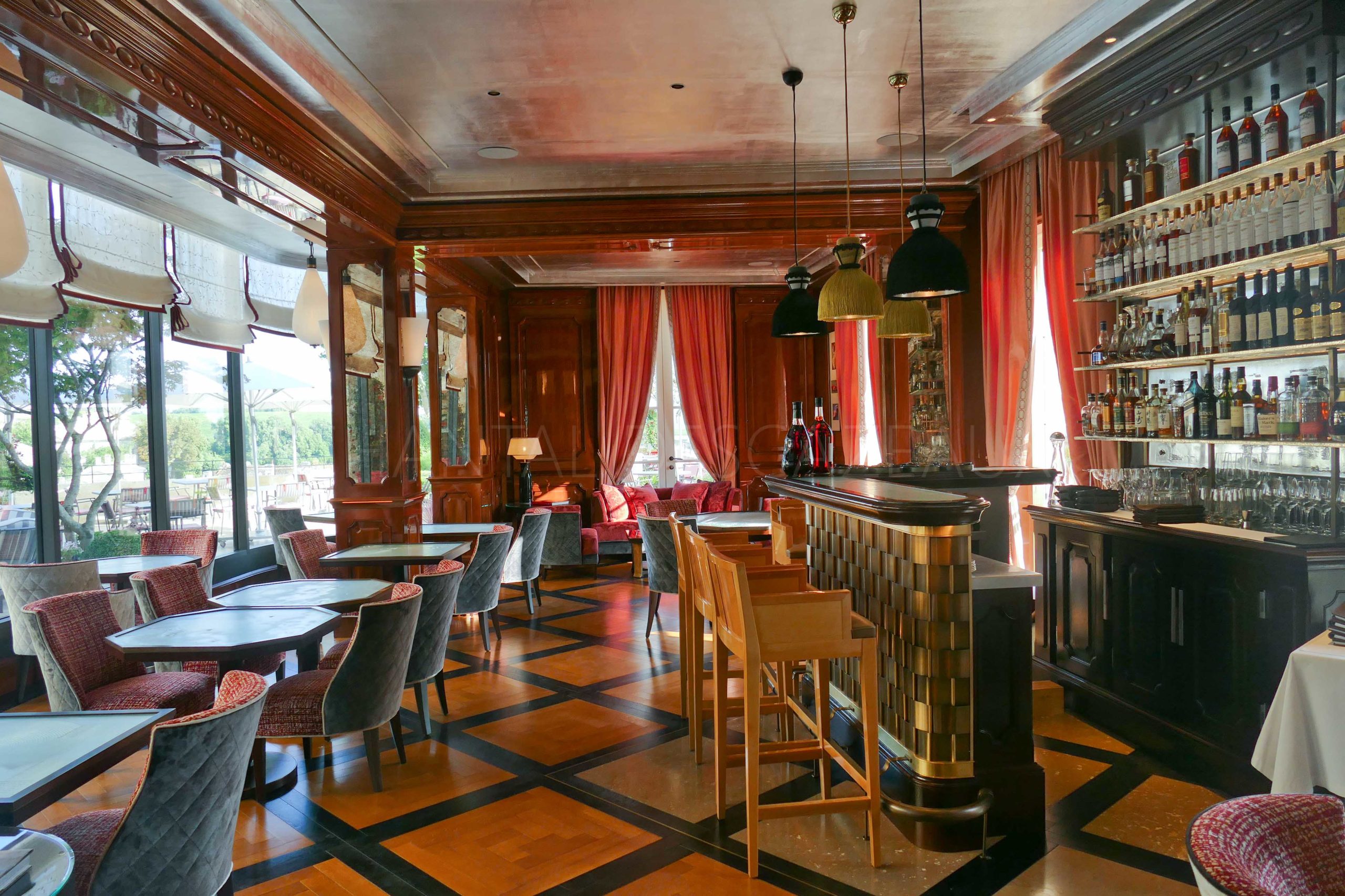 Direction ensuite la magnifique salle, qui a été l’objet de quelques modifications dans la déco, une rénovation signée Giorgio Azzi ; des couleurs claires et intemporelles qui diffusent la lumière, toujours une belle hauteur sous plafond et le thème de la vigne omniprésent avec des touches délicates et subtiles.