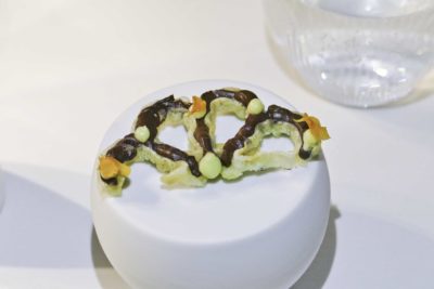 Dans ce dessert, le chocolat est travaillé dans l’esprit d’un Saint-Honoré. Feuilleté chocolat, choux, ganache et crème glacée. Un jus mucilage (partie blanche de la cabosse de cacao) est ajoutée devant le client. De très belles textures, un feuilletage extraordinaire, beaucoup de gourmandise, top!