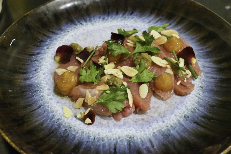 Le veau en carpaccio s’acoquine d’un condiment aux câpres, de purée d’amande et d’huile de noix en assaisonnement. Une entrée pleine de délicatesse, c’est original et bien fait.