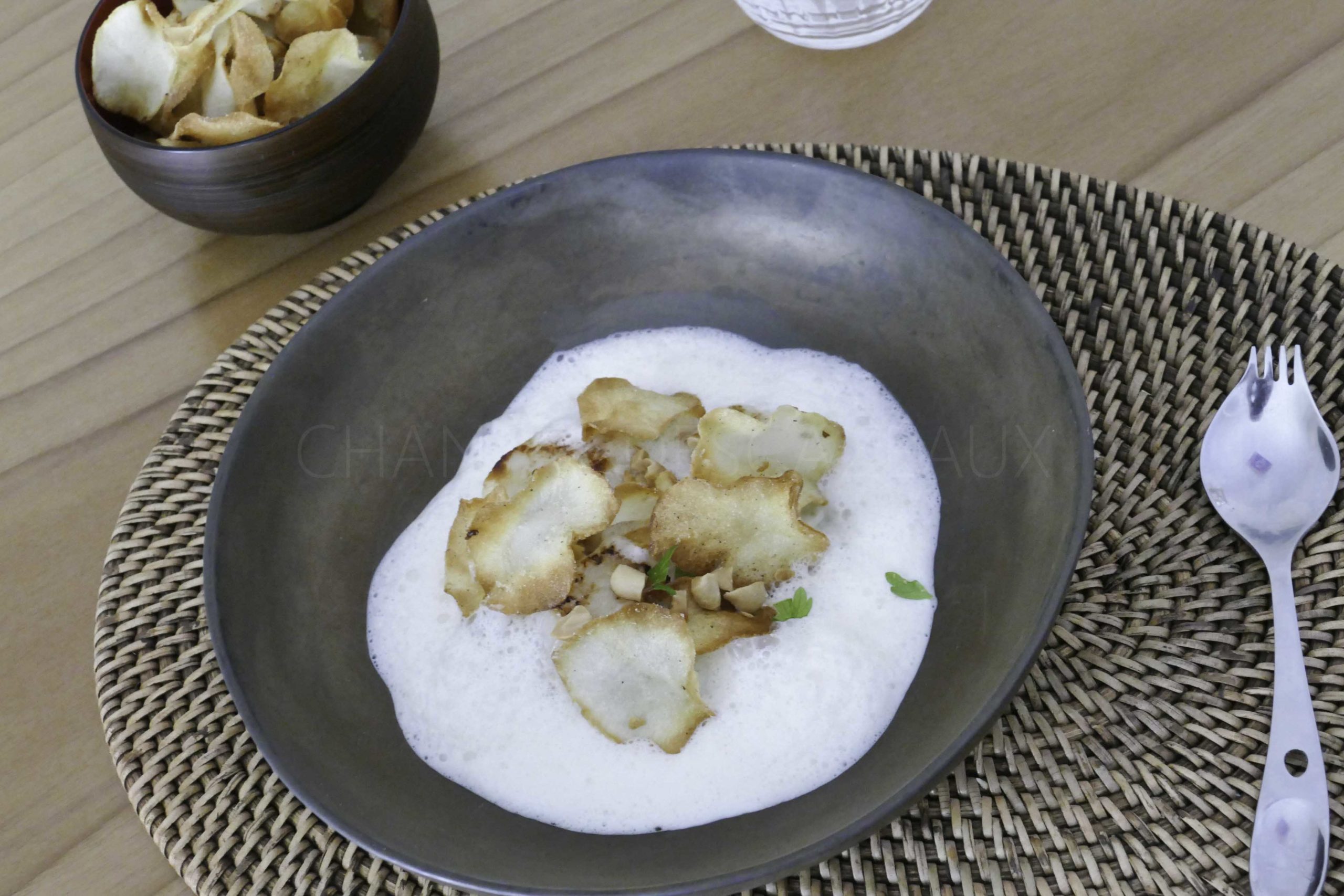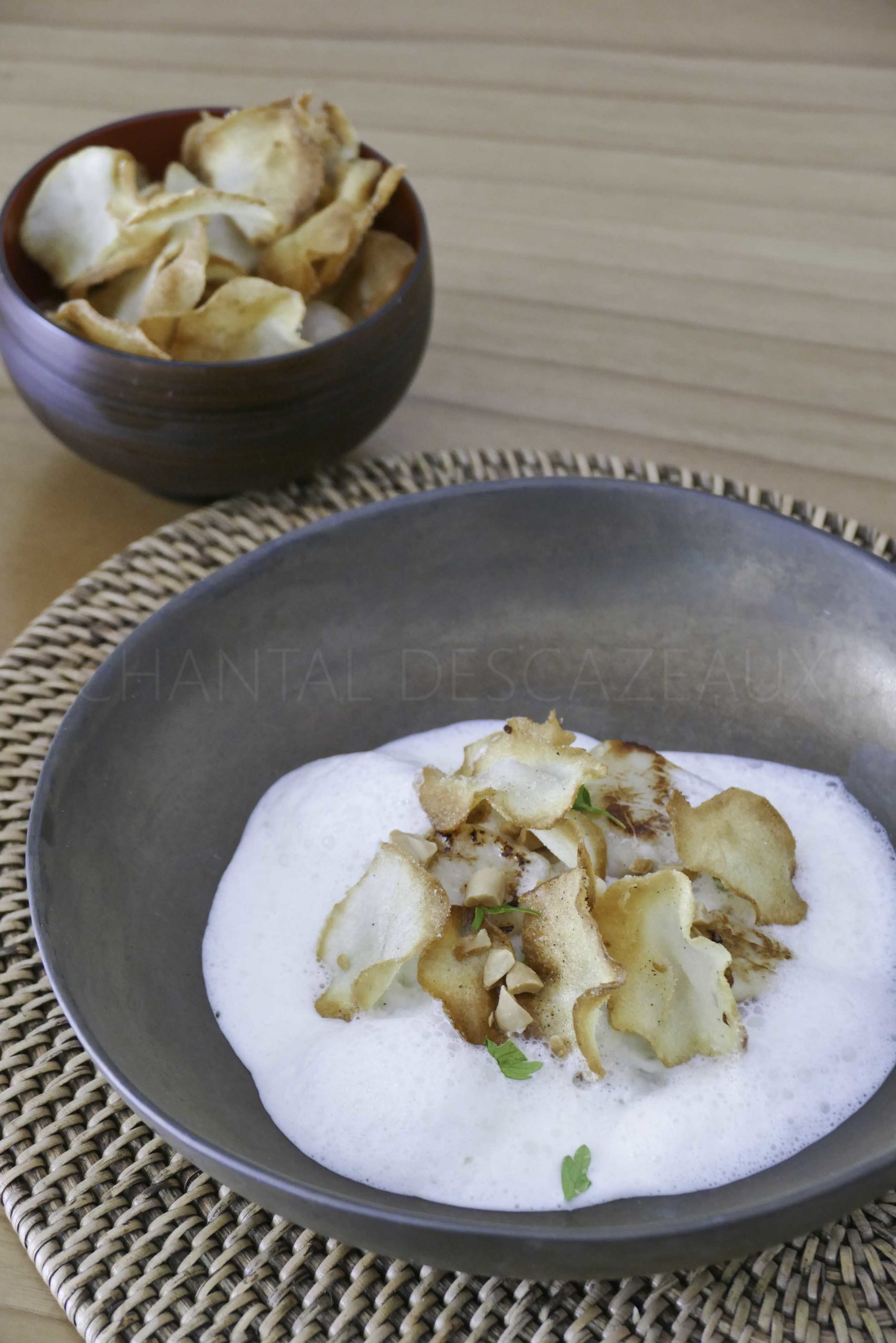 Saint-Jacques, topinambours fumés et en chips, lait de cacahuètes
