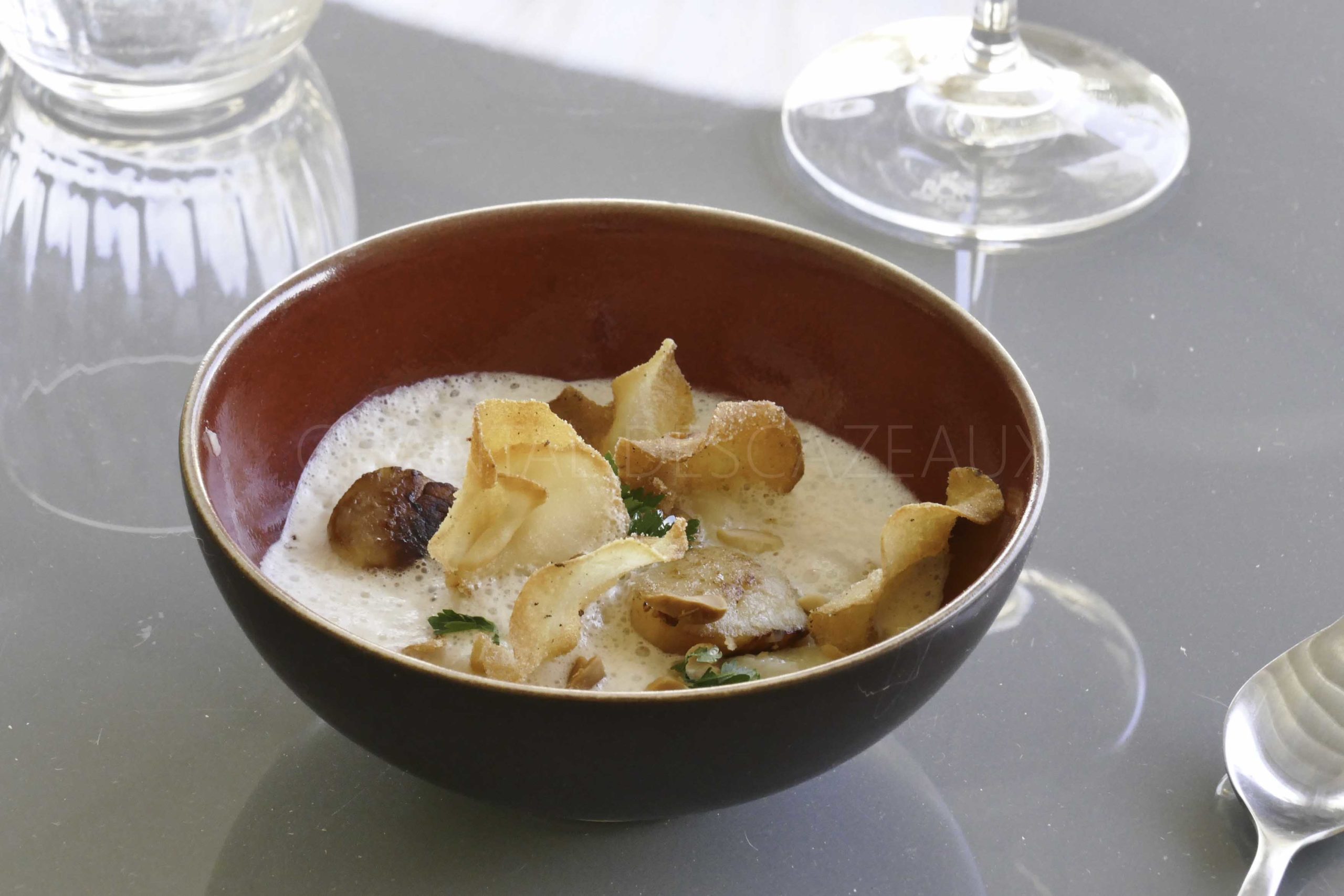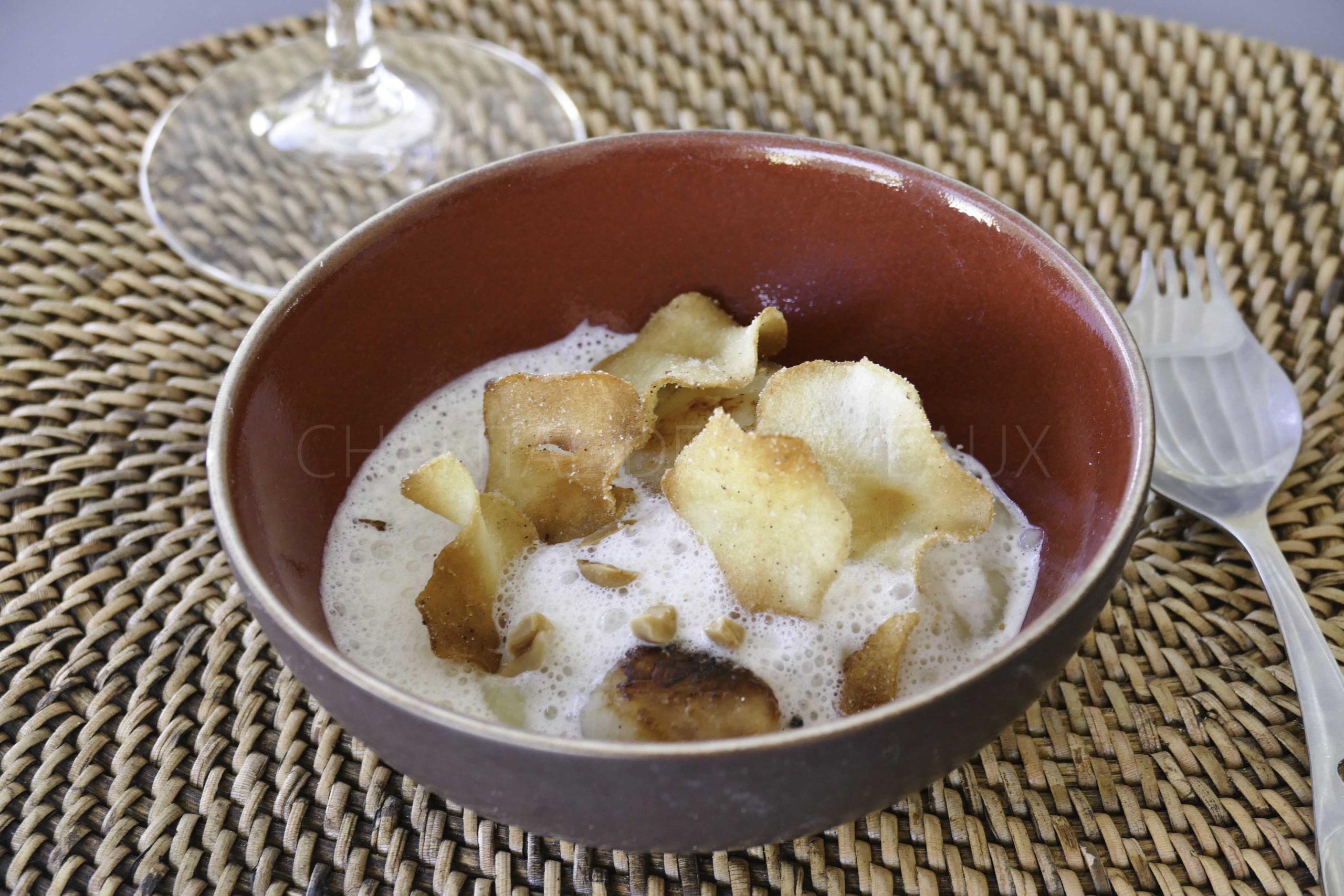 Saint Jacques, purée topinambours fumée, chips, lait de cacahuètes