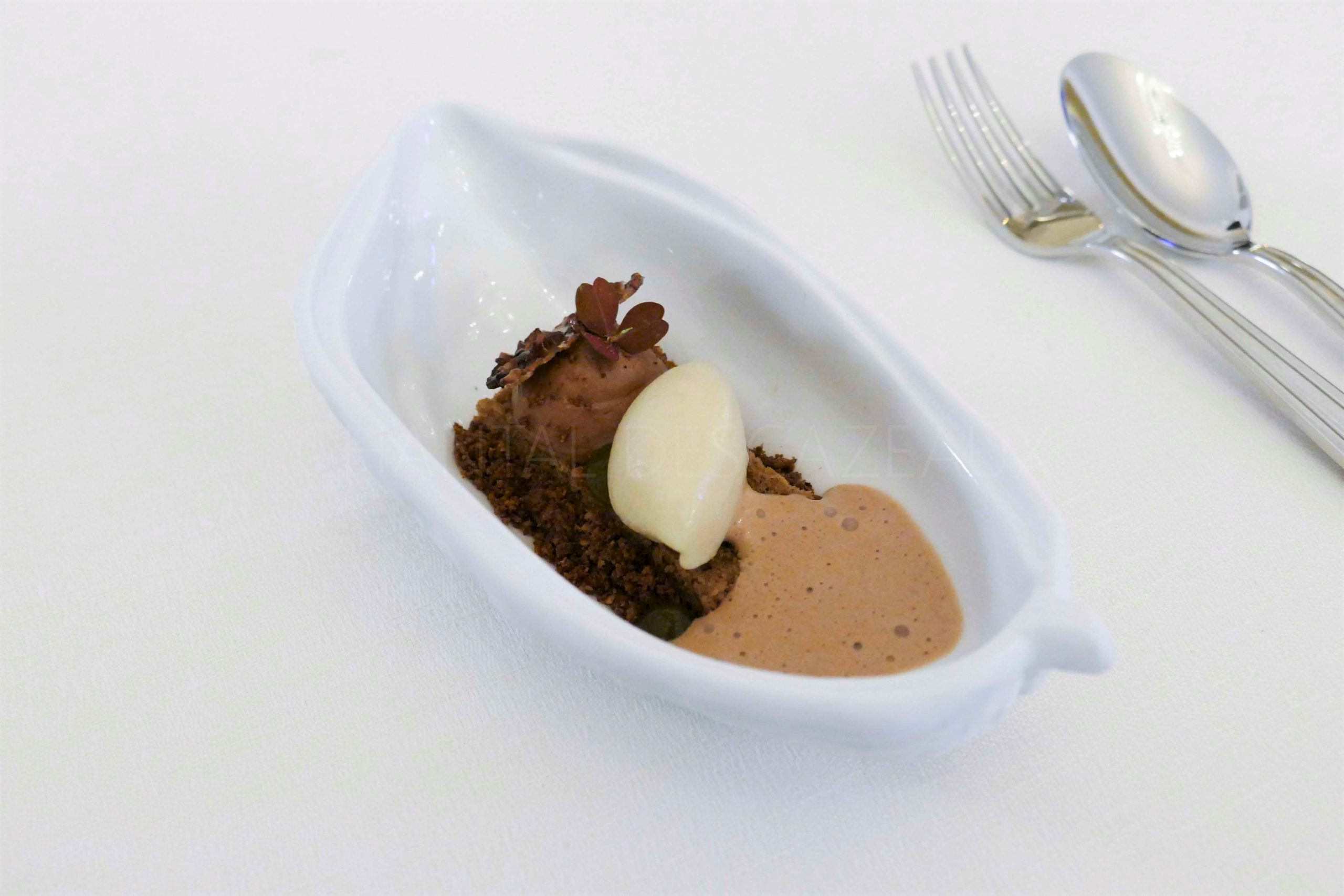 Chocolat Valrhona et oxalis: en ganache, sorbet cacao et oxalis, grué cacao croquant