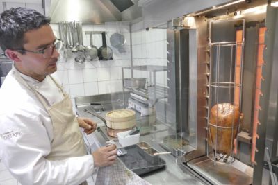 Pour l’adapter au Pays Basque, la peau va ensuite être laquée d’un jus de cane infusé aux noyaux de cerises d’une gourmandise incroyable. Ce plat est servi avec une purée traditionnelle en hommage à Joël Robuchon, et fricassée de girolles (saison).
