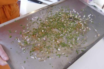 Avant que le mélange durcisse, répartir la fine brunoise d’échalote et herbes. Ajouter zestes et piment d’Espelette. On peut aussi ajouter des flocons d’algues (thème iodé ^^) ou autres herbes selon votre envie, baies roses…