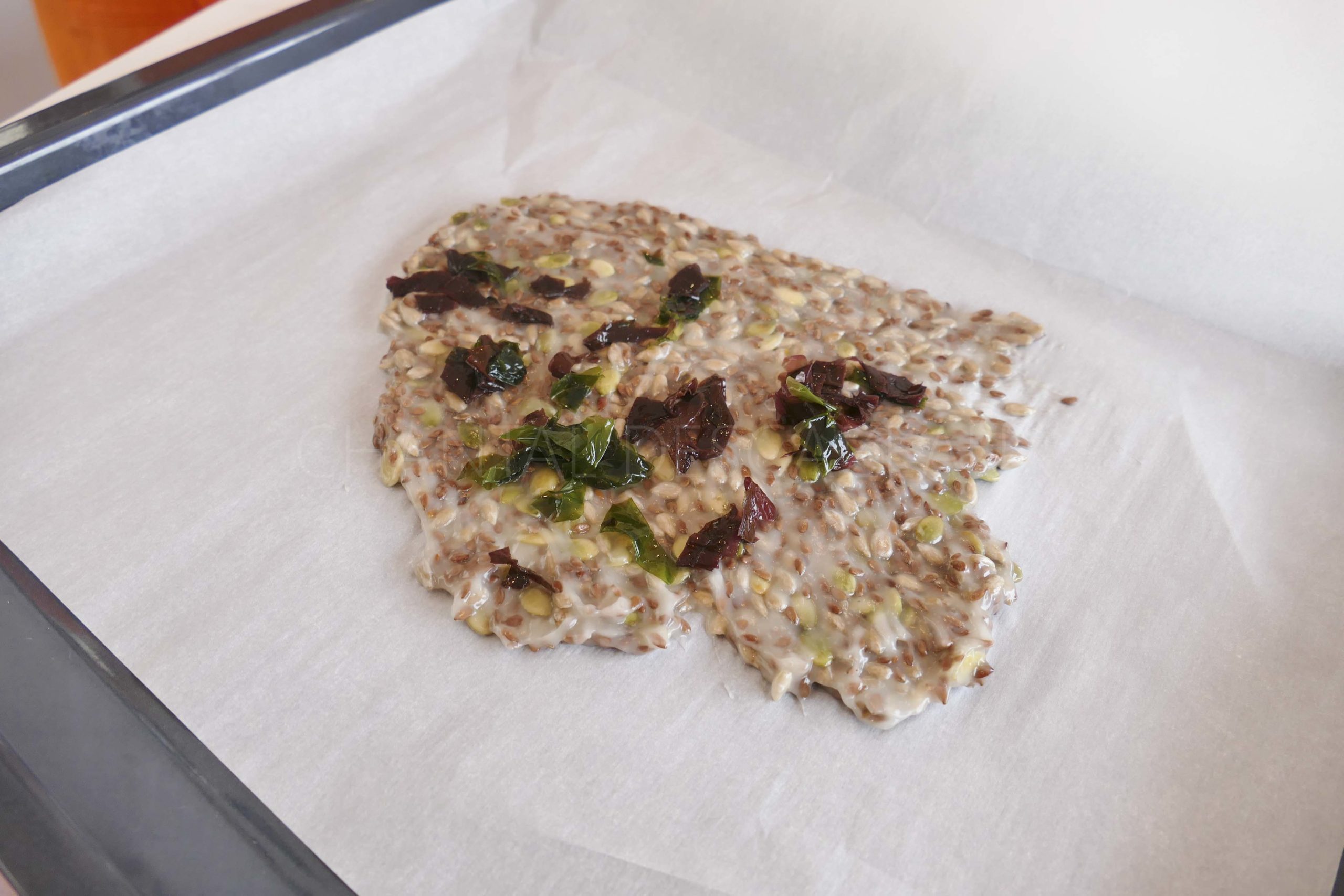 Etalez cette pâte entre deux feuilles de papier sulfurisé et étalez en fine couche. Déposez éventuellement quelques algues.