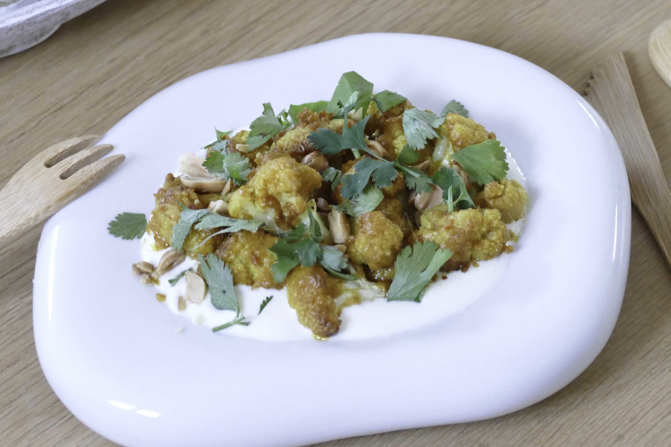 1 chou-fleur, 300 g de yaourt grec, 400 g de lait de coco, 3 cuil. à s. de beurre de cacahuète, 1 cuil. à s. de cassonade, 1/2 cuil. à c. de piment, 1 cuil. à c. de curcuma, 1 gousse d’ail, 1 poignée de cacahuètes, feuilles de coriandre fraîche, jus de citron, sel et poivre