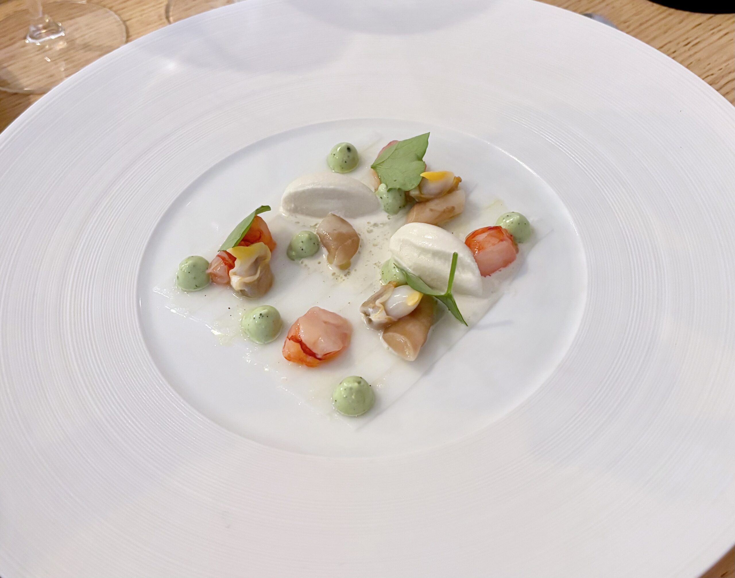 Cueillette marine, Carpaccio de seiche, coquillages, gambero rosso, mayonnaise au plancton marin et sorbet iodé à l’eau d’huitre