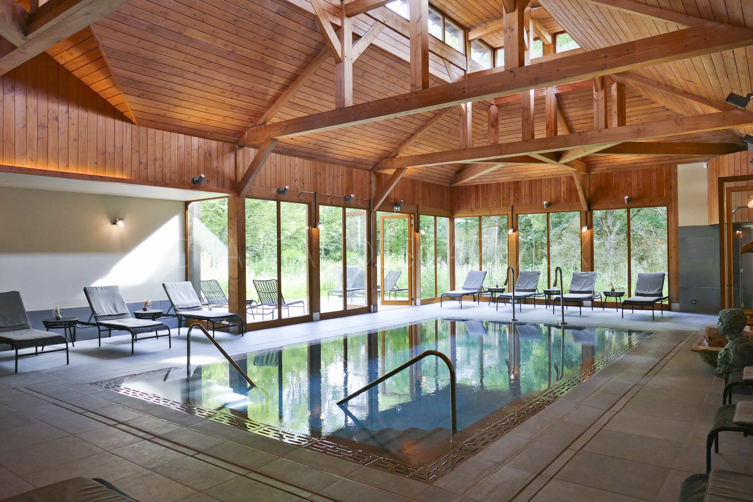 Piscines extérieure et intérieure, bain à remous cerclé de bois de chêne comme un tonneau, hammam… et bien sur tous les soins prendre soin de soi!