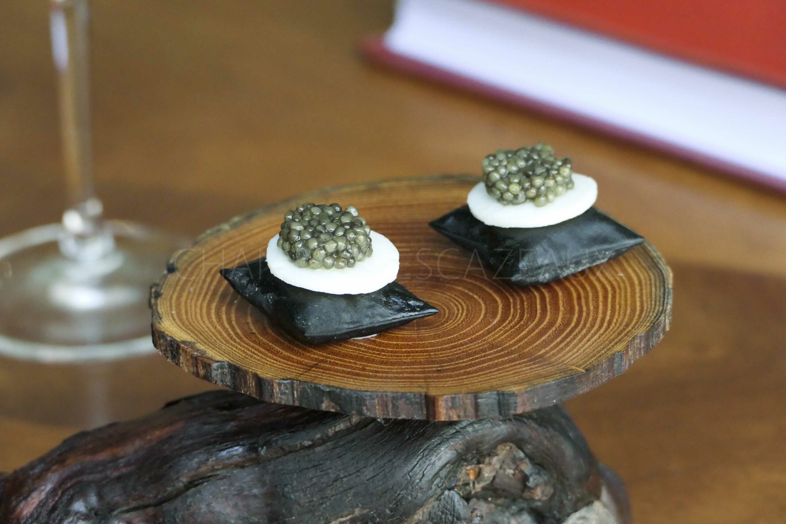 Meringue de carotte retravaillée avec une crème de padron et truite des Pyrénées ; croustillant terre mer, tartare de boeuf de Bazas et huîtres du Bassin d’Arcachon, crème verveine citronnelle et gingembre ; pain soufflé à l’encre de seiche, raifort, disque de seiche et caviar osciètre de la Maison Sturia ; tartelette de seigle, tourteau dormeur de l’île d’Oléron et estragon