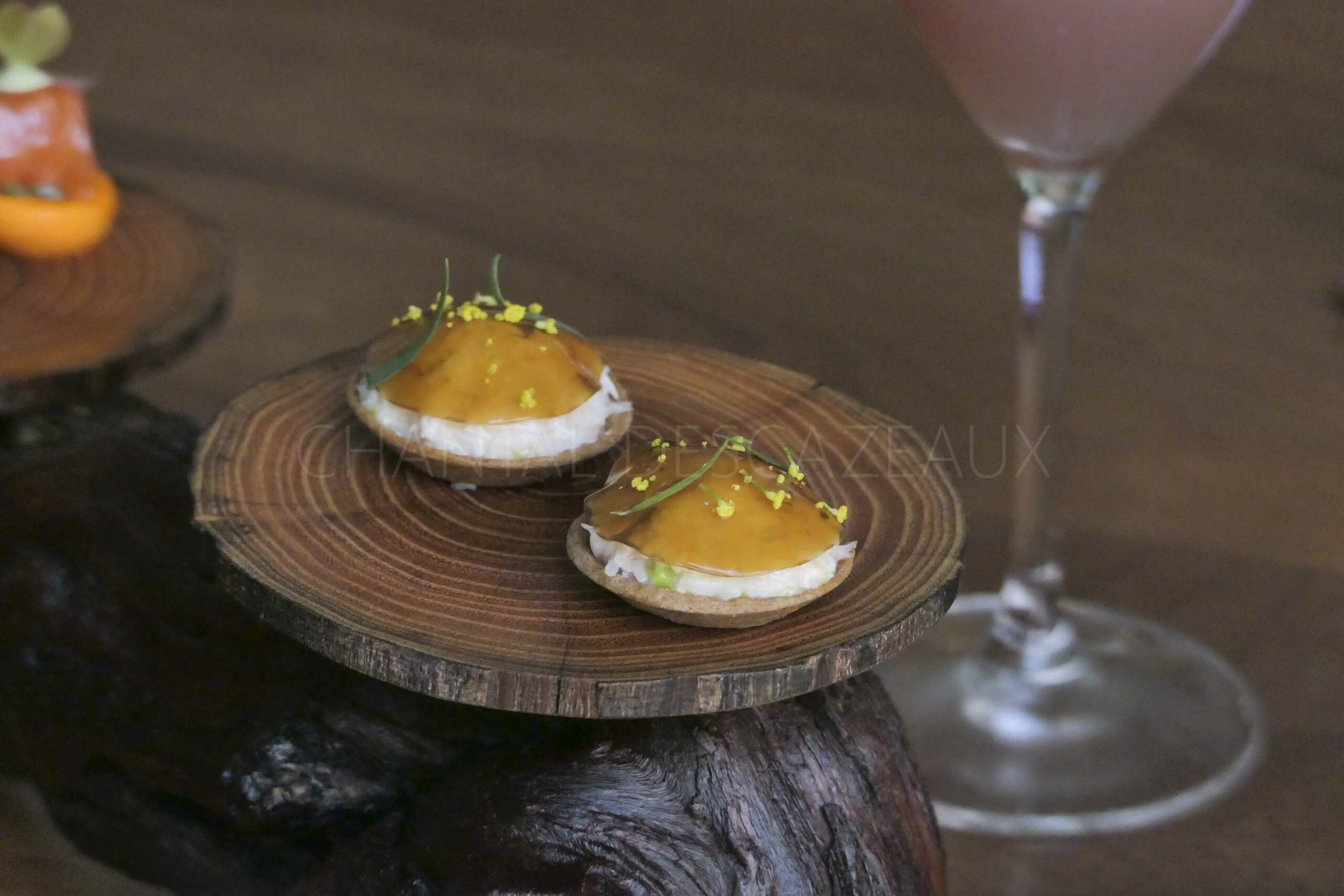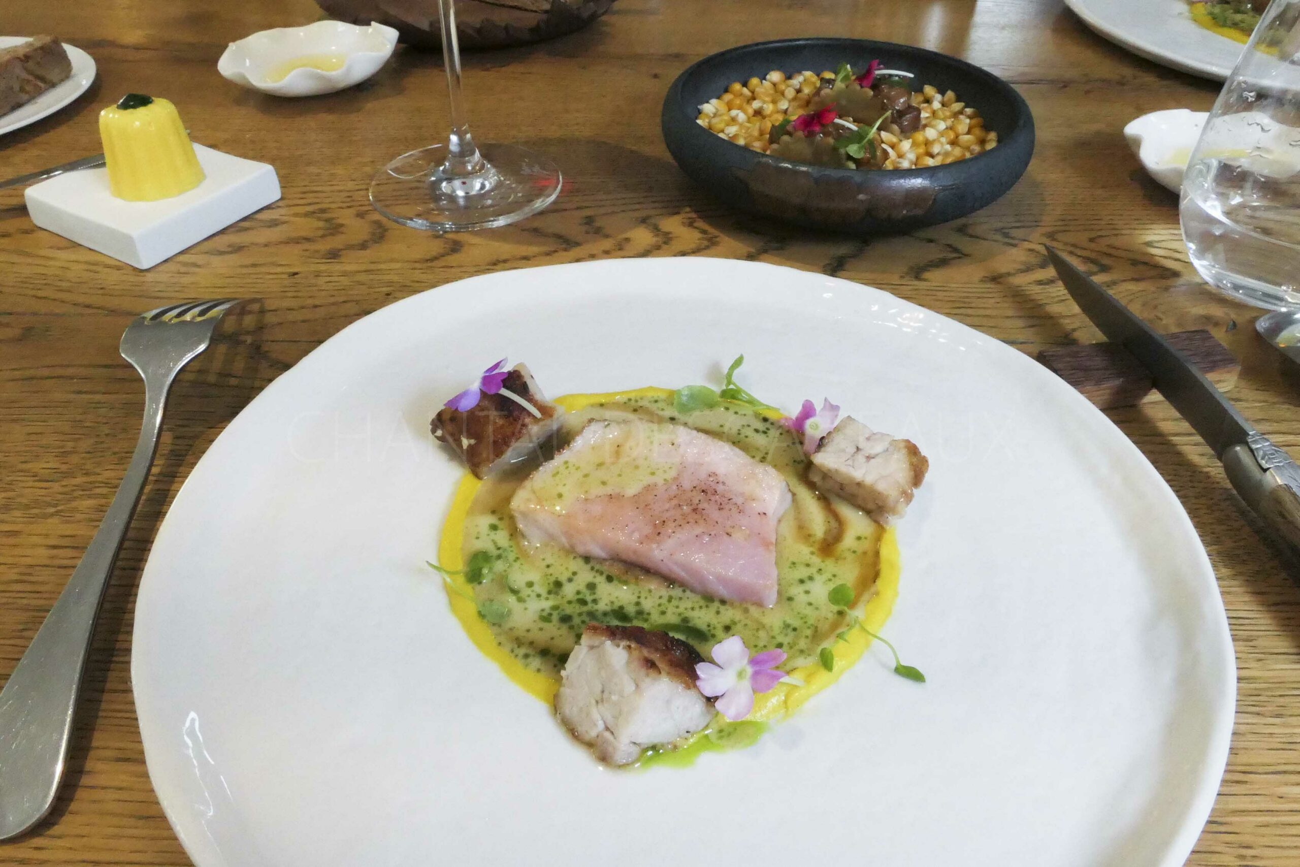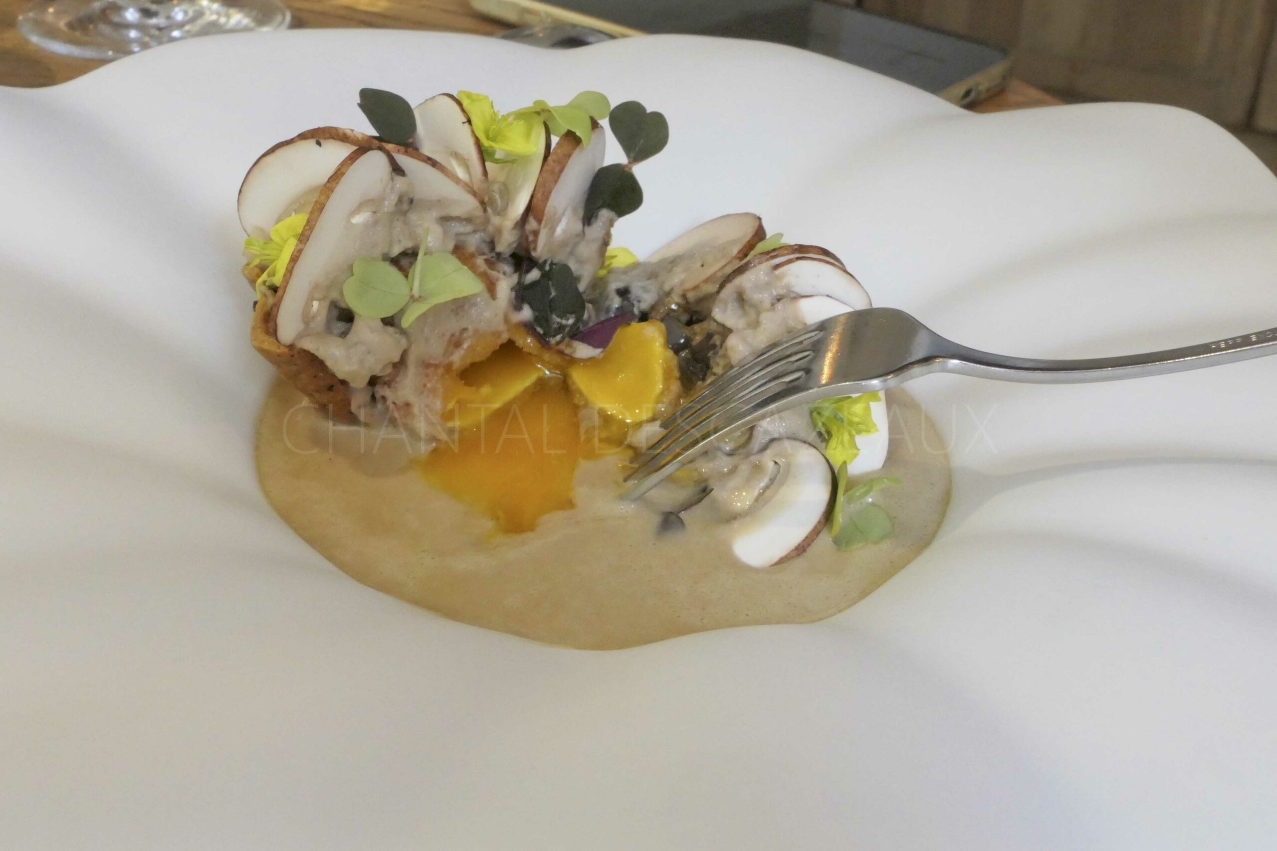 Le champignon dicte l’assiette et ce n’est pas seulement un plat visuel, les saveurs et textures sont au rendez-vous. Un magnifique travail donc avec cette tartelette de champignons des carrières de la propriété à Saint-Emilion.