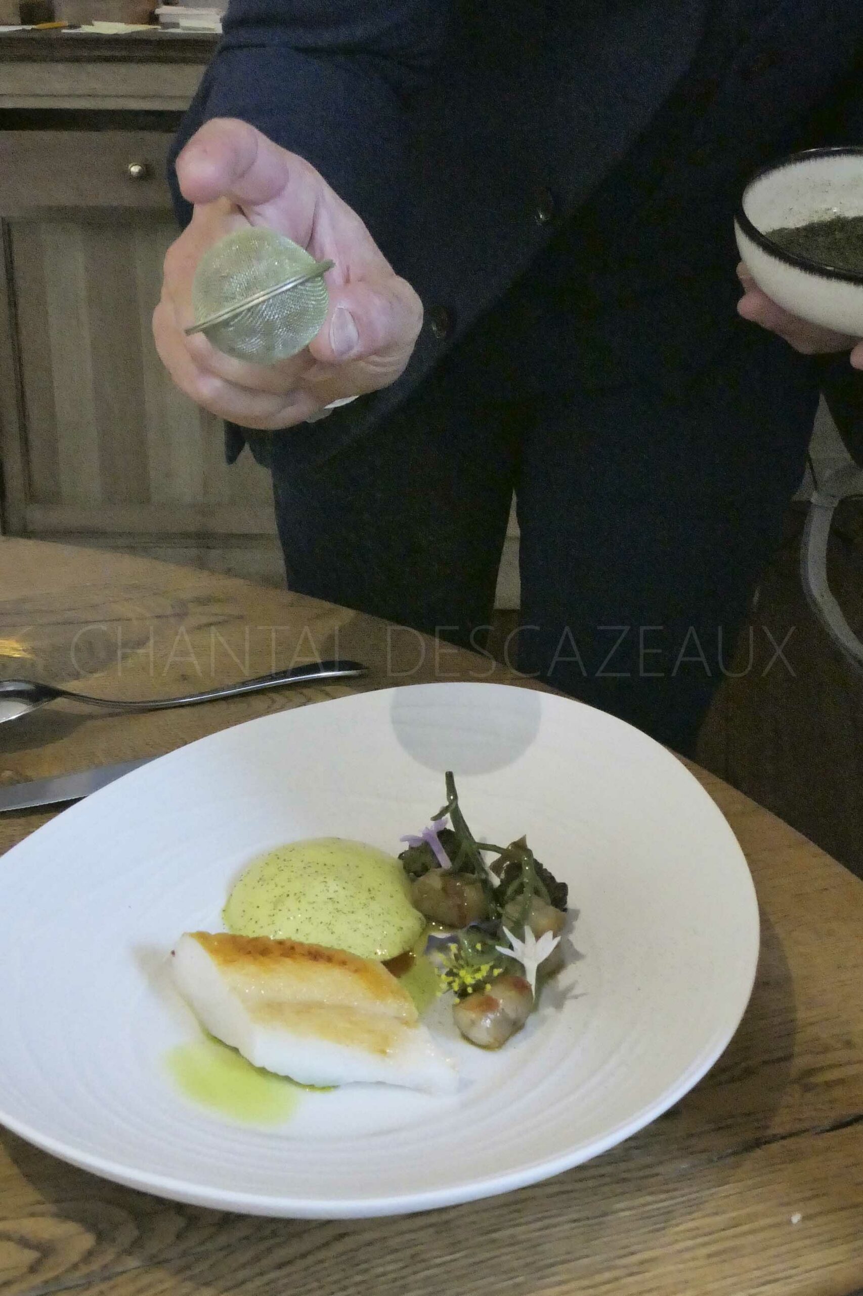 Filet de Saint-Pierre fumé aux sarments de vigne de Saint-Emilion, déclinaison autour du chou romanesco du jardin, rôti et en purée, salicornes et crevettes, émulsion de poivre de timut et livèche, poudre d’algue Kombu et livèche. Un plat dingue de saveurs!