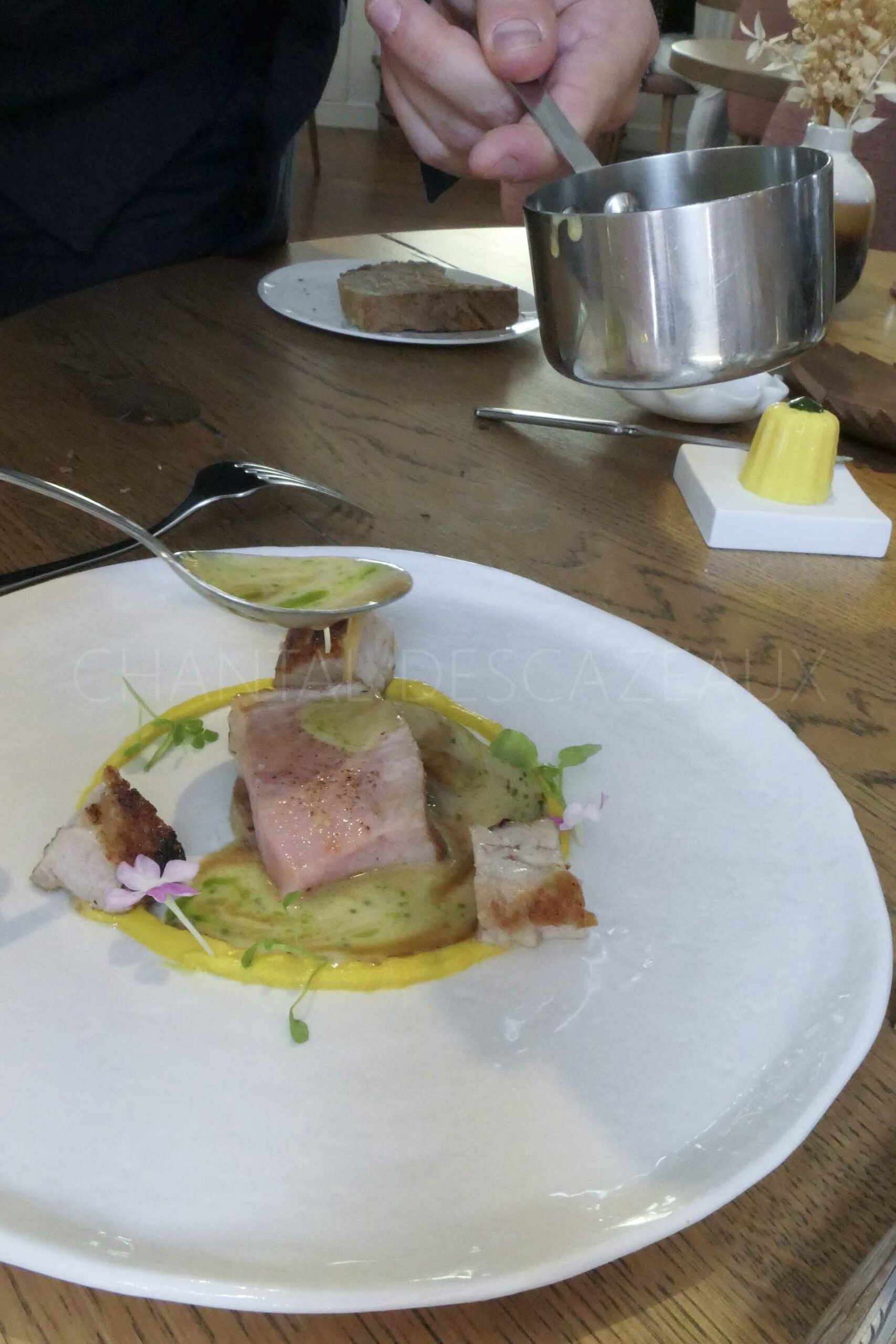 Conseil du Chef : saucer l’assiette avec toutes les sauces en même temps avec un délicieux pain brioché qui représente le pavé de Saint-Emilion.
