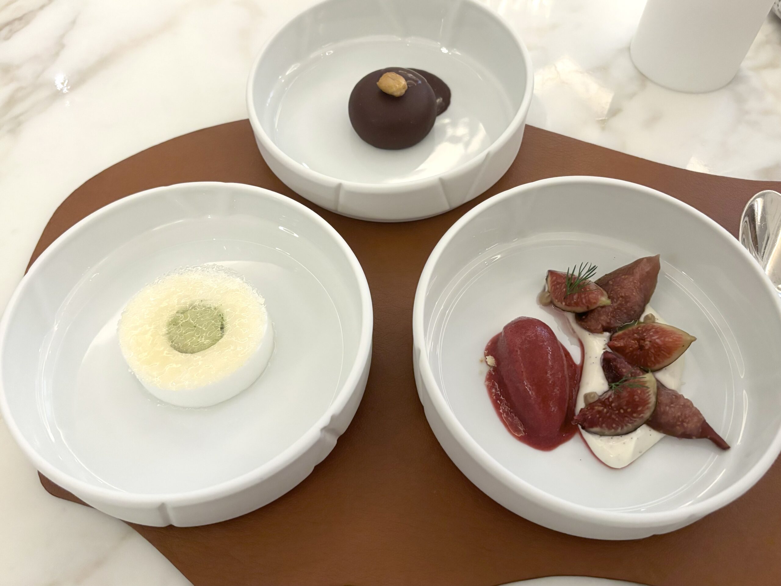 Ile flottante, sirop de mélisse, coulant pruneaux, opaline et crème anglaise aux baies de la passion ; Figue pochée et fraîche, glace cerise et pannacotta vanille ; Choconuts comme un snickers