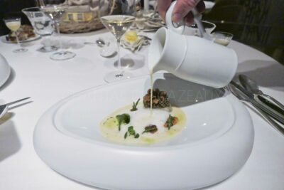 Bouillon de poule safrané, vin d’Yquem, infusion citronnelle, zestes d’orange, céleri branche, romarin, crème battue, poivre de Penja… Le bonheur est dans la sauce, je confirme. Et comme à chaque plat, la sauce se mange jusqu’à la dernière goutte, avec du pain, ou à la cuillère, les contenants repartent vides!