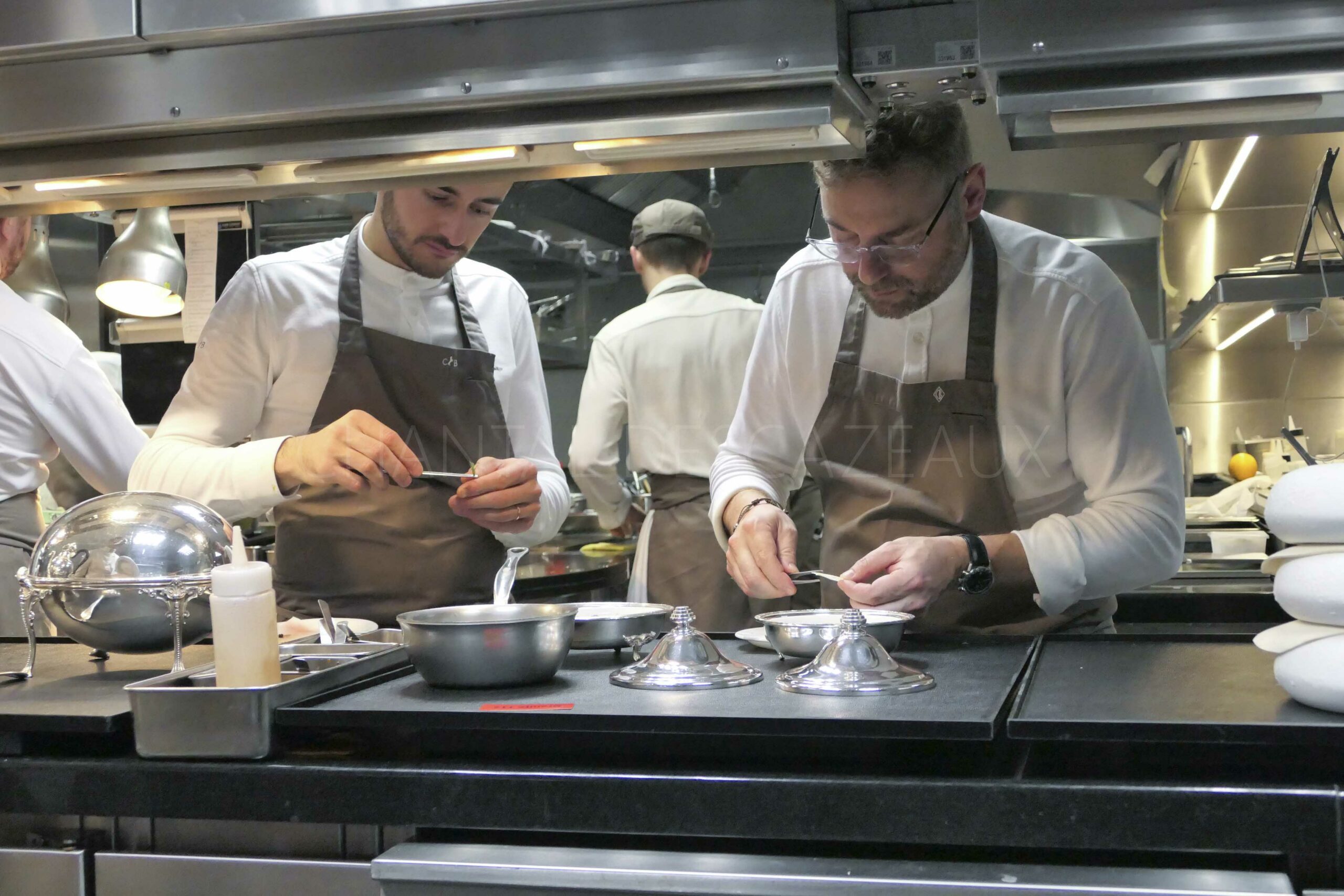Puis la consigne est donnée: Arnaud Donckele avait toujours rêvé de mettre en valeurs ses premières amours, les Sauces. Chaque assiette sera accompagnée d’une sauce, que l’on goutera au préalable toute seule avant de commencer le plat, afin d’apprécier son équilibre, sa texture, sa vivacité et sa fraîcheur.