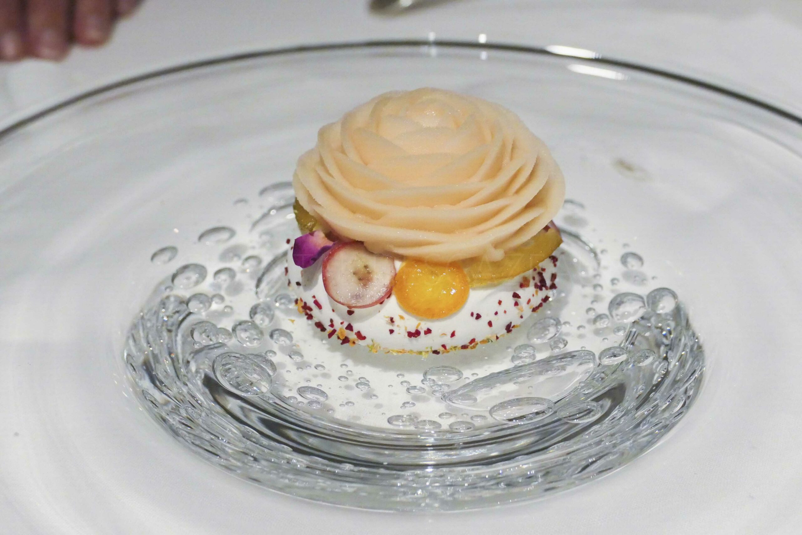 Une précision chirurgicale, un dessert à l’esthétique tellement parfaite qu’on a du mal à le briser! Fleur de pétales de meringue croustillante, un dessert avec un insert très agrumes qui joue l’osmose avec une sauce aux endocarpes, la partie charnue des agrumes qui viendra flotter autour de la fleur. Cette sauce dessert est enrichie de jus de raisin, verjus, liqueur de sureau, pétales de raisin et bien sûr endocarpes d’agrumes… Du grand art, de la légèreté, exceptionnel!