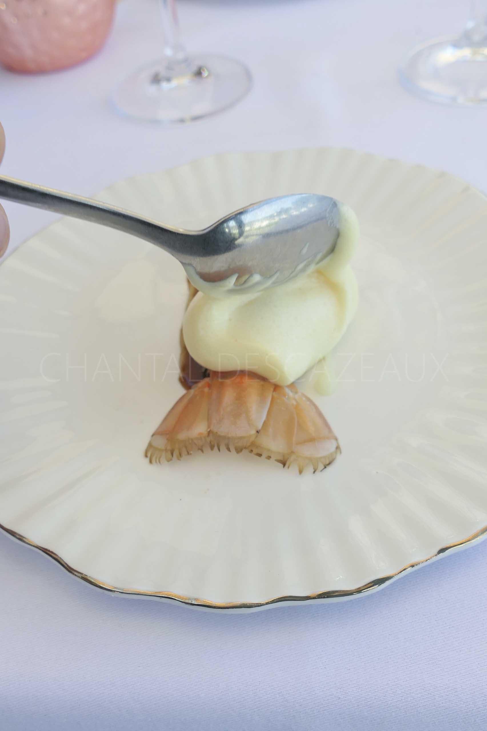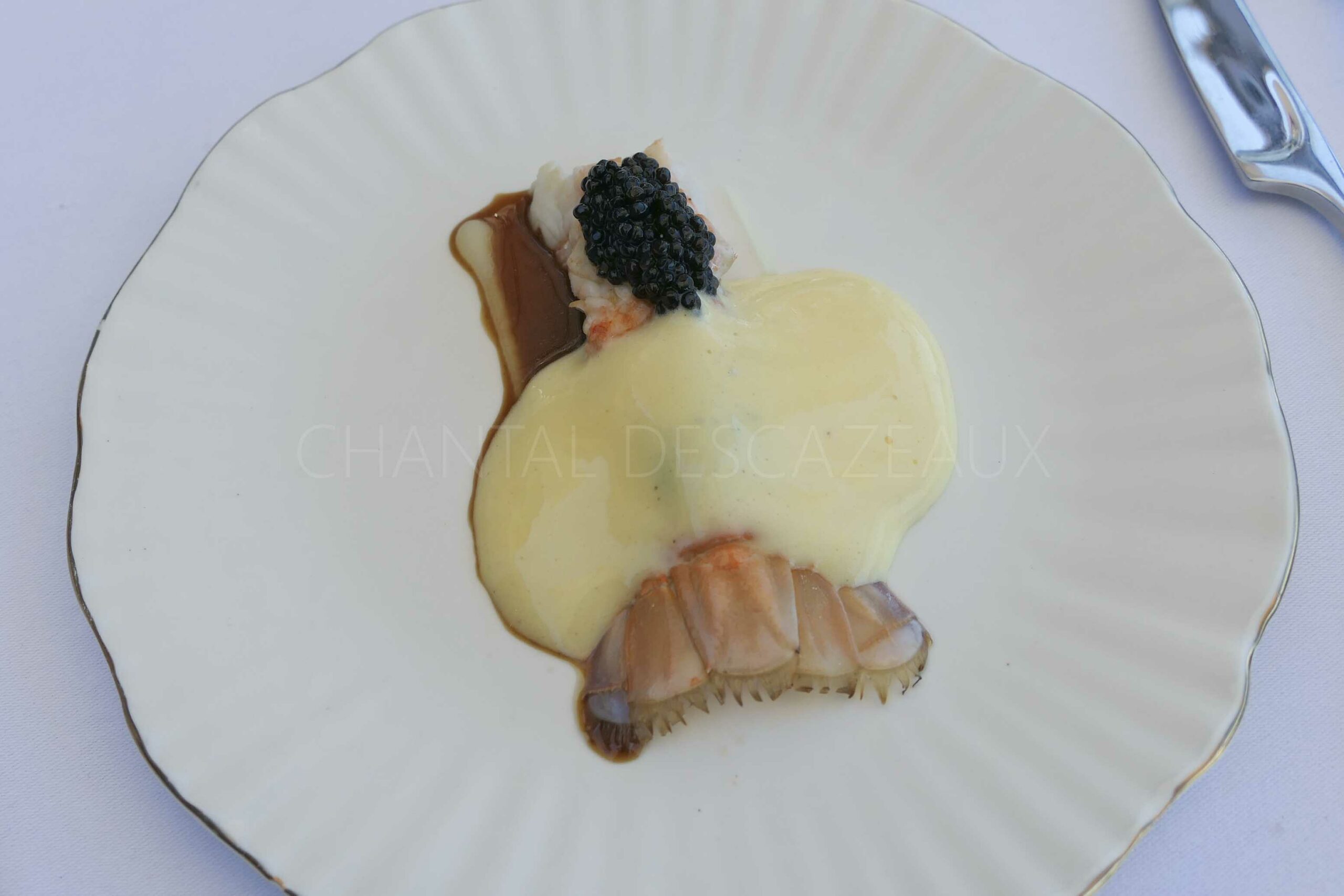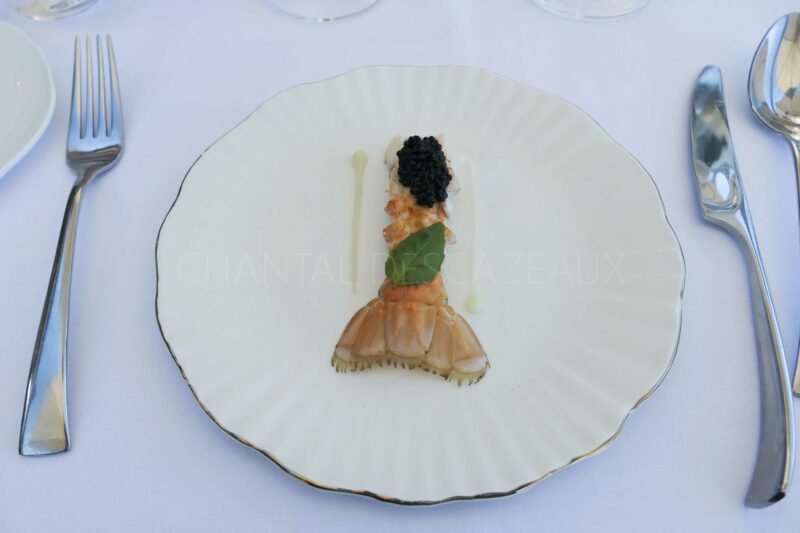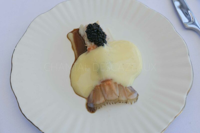 Langoustine nacrée, caviar d’Aquitaine, réduction de jus de poisson goûteuse et enveloppante, beurre au Pastis en sabayon mousseux… un plat avec quelques notes méditerranéennes en clin d’oeil au parcours du Chef sur la Côte d’Azur. Parfait équilibre, excellent.