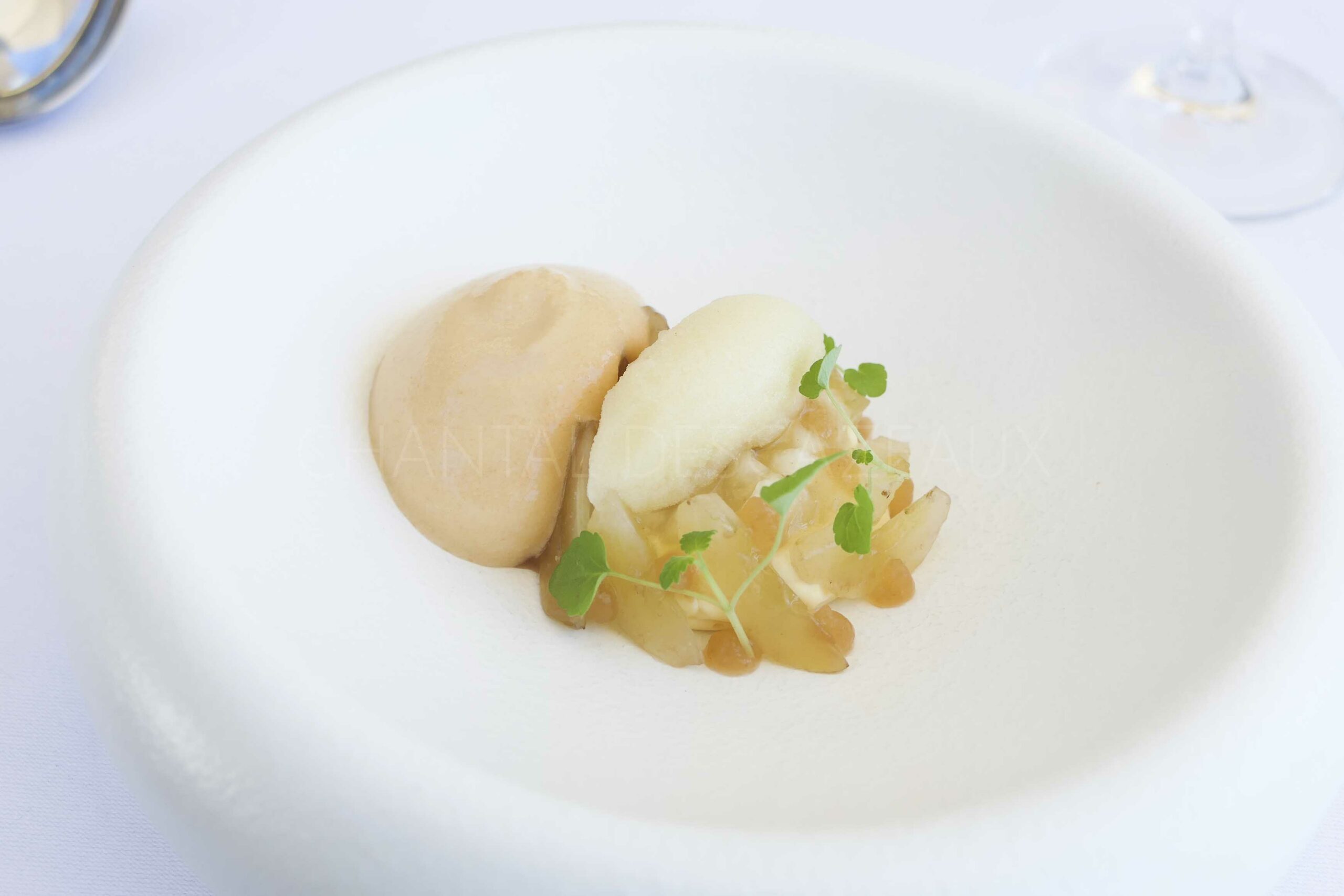 Crémeux miel d’acacia, compotée de poires, gel verjus, sorbet thé Darjeeling, émulsion verjus et raisin