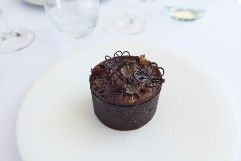 Chocolat , gavotte cacao, crémeux huile d’olive, glace, brunoise d’olives vertes, spoom chocolat