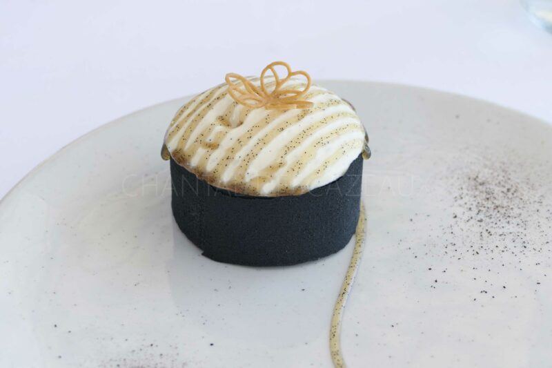 Vanille de Madagascar, granola de céréales, spoom et glace vanille brûlée, caviar de vanille, tuile charbon végétal.