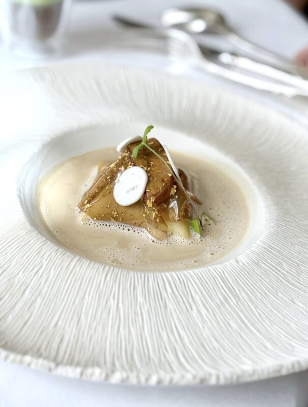Signature (plat que le Chef a créé en 1996 et qu’il laisse à sa carte) – Ma raviole de champignons bruns au foie gras