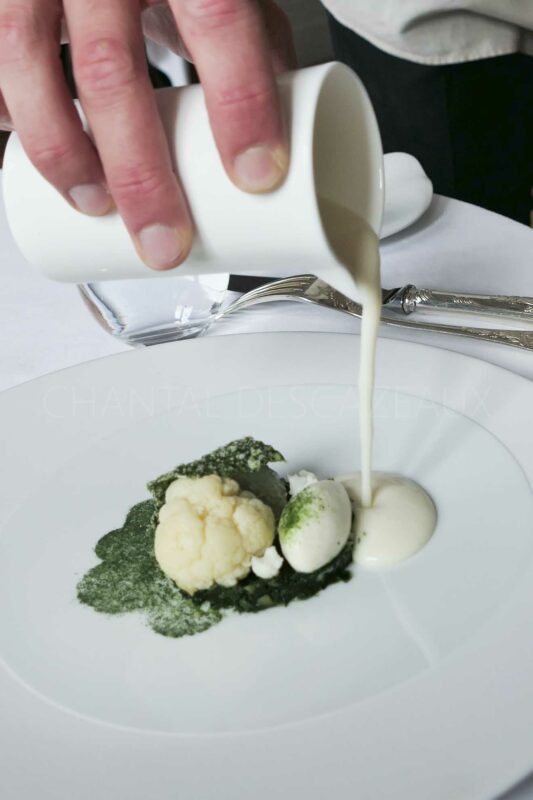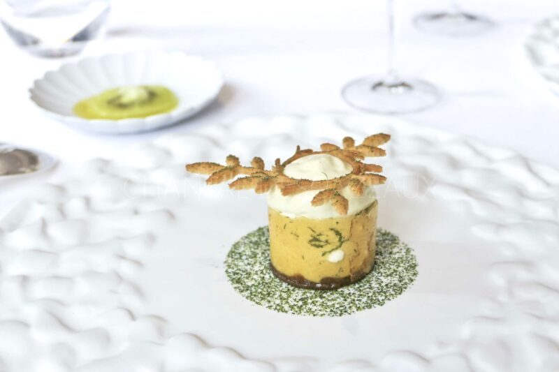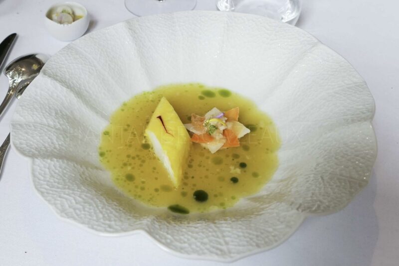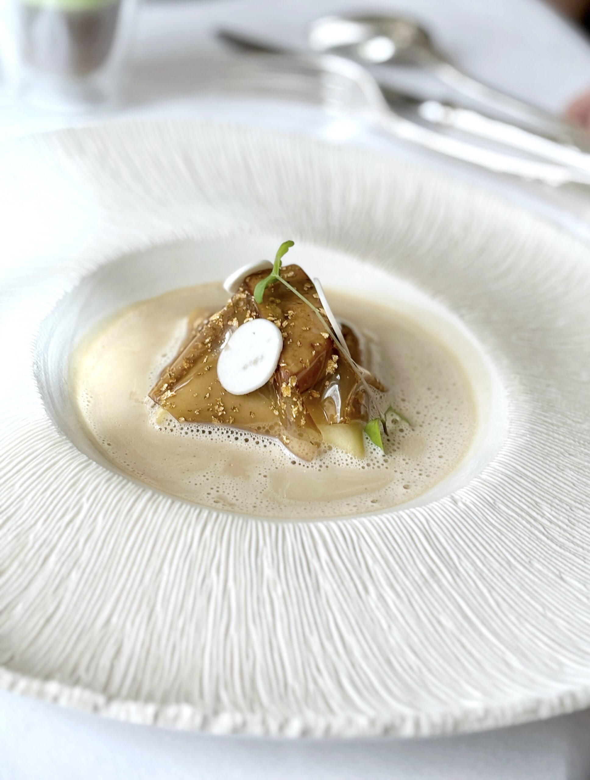 L’harmonie parfaite entre douceur, amertume et salinité. Le chou-fleur est infusé dans un lait au shiso vert offrant un très beau contraste avec le tartare d’algues et citron confit, saké travaillé en diamants de gelée… un plat coup de coeur qui garde un fil conducteur, un plat qui surprend par ses saveurs et son équilibre parfait et sa précision, vraiment topissime.