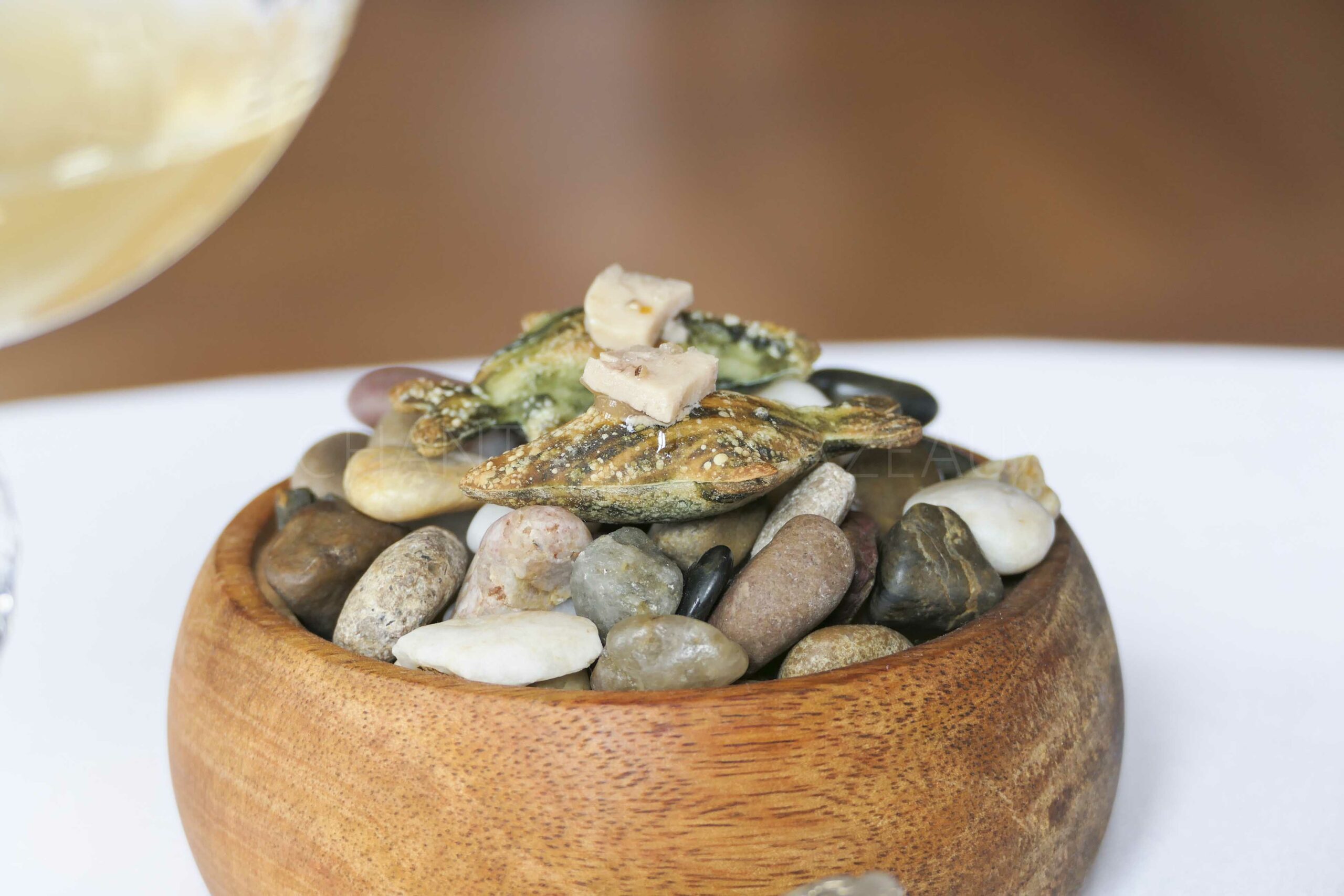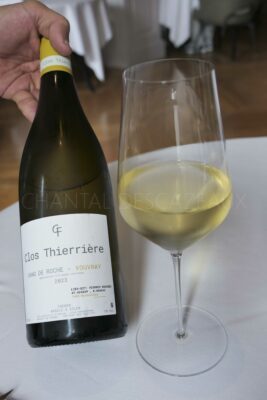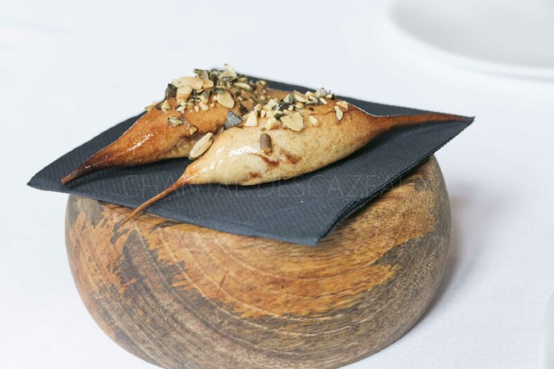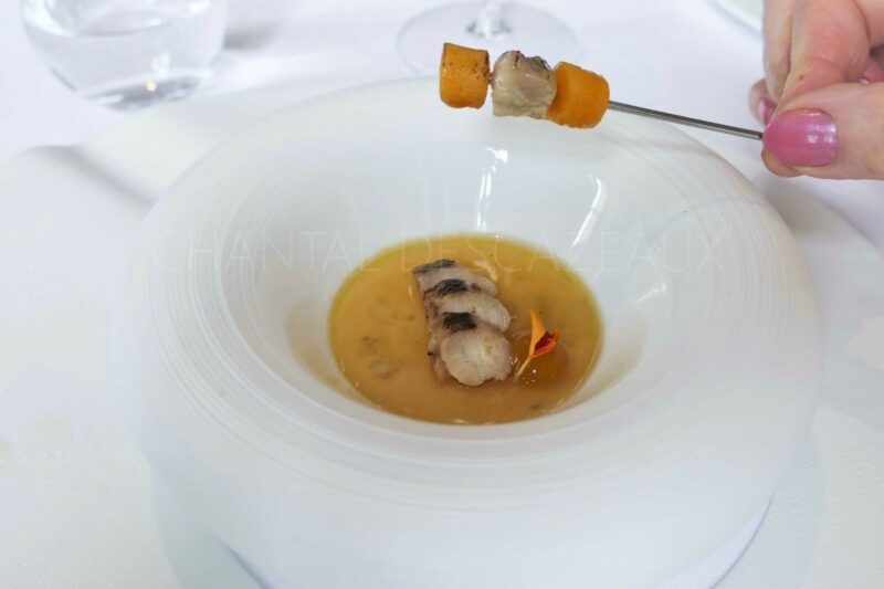 L’idée était de travailler des produits « à la japonaise », mais avec une origine locale. Ici courge Kabocha, anguille fumée et sauce soja locale produite au Château Coutet à Saint-Emilion. La courge est travaillée en compotée acidulée et en royale, l’anguille comme une matelotte avec un Pessac-Léognan, baguette aux graines de courges pour saucer entre chaque bouchée. Brochette grillée autour de la courge et de l’anguille assaisonnée avec cette sauce locale, une très belle composition originale et riche en goûts et textures.