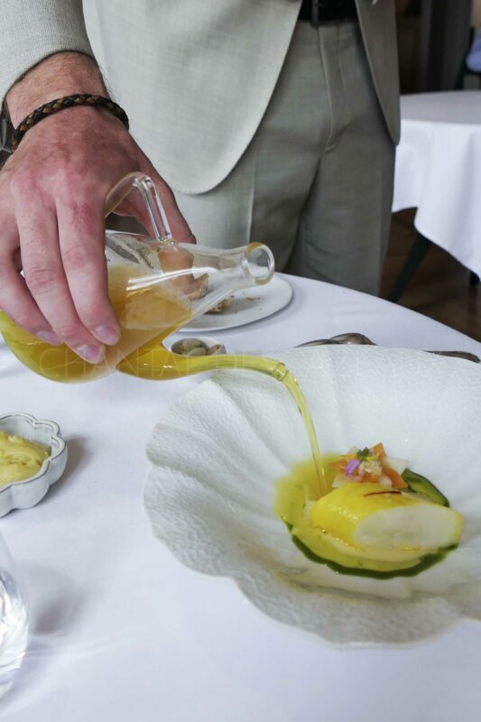 Plat traditionnel de pêcheurs réalisé ici avec la barbue d’Arcachon confite, légumes de gironde, sauce pilpil, aïoli tout en légèreté monté minute avec une huile au safran de Libourne, bouillon de poissons ; une symphonie de saveurs iodées, c’est justement relevé, savoureux, excellent.