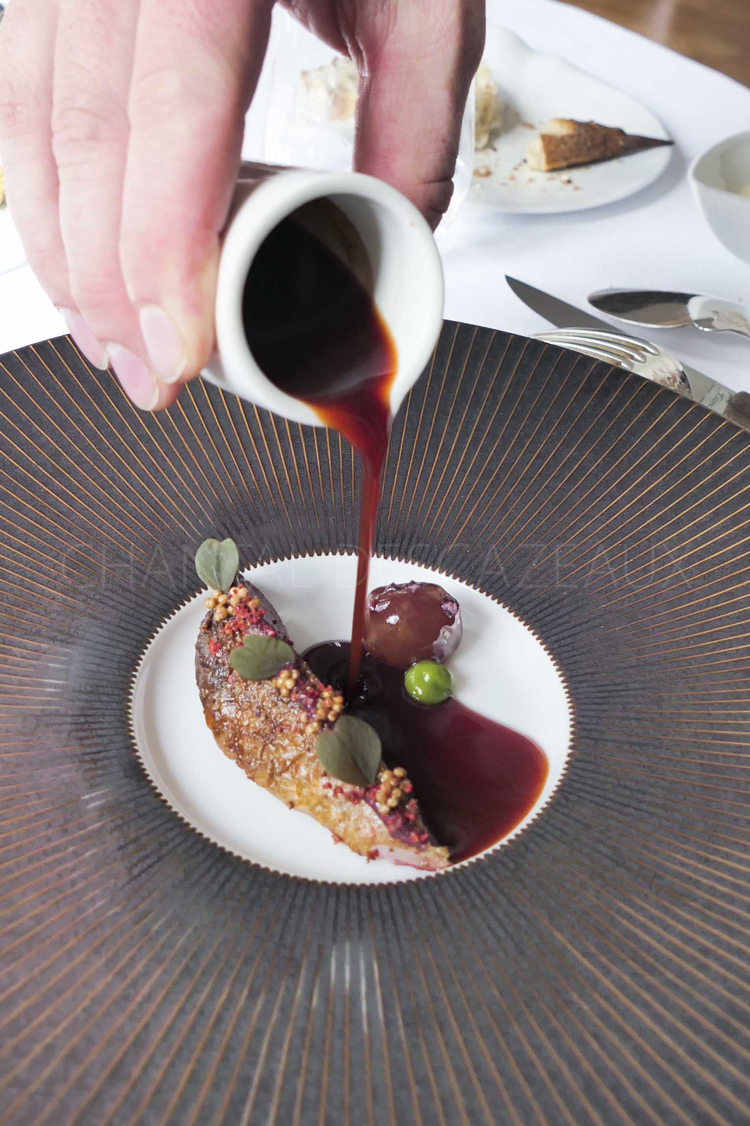 Pigeon Vendangeur – Pigeon rôti sur le coffre, cèpes, raisin à la moutarde, jus réduit au Merlot