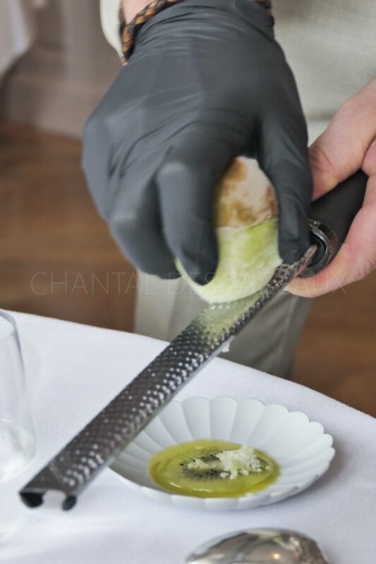 Le kiwi de l’Adour est ici magnifié en dessert explosif de saveurs. Le kiwi est travaillé cru et cuit, en sorbet kiwi tagète de chez Damien Blasco, mousse caramel citron brûlé, tranche de kiwi associé au persil, huile d’olive et citron, un dessert qui bouleverse le palais, absolument splendide.