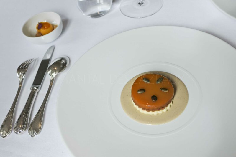 Un dessert surprenant et hyper travaillé autour de 3 produits, la courge, le café, et l’orange de Dordogne. Palet de butternut confit aux 4 épices, café et cascara, crème de café cuite comme une crème anglaise, chantilly orange chinotto (liqueur d’orange amère), biscuit épicé avec une réduction orange et butternut, sorbet butternut orange, et streusel pour terminer. Un superbe équilibre entre tous les éléments, des textures en bouche, rien ne domine, tout s’harmonise, superbe!