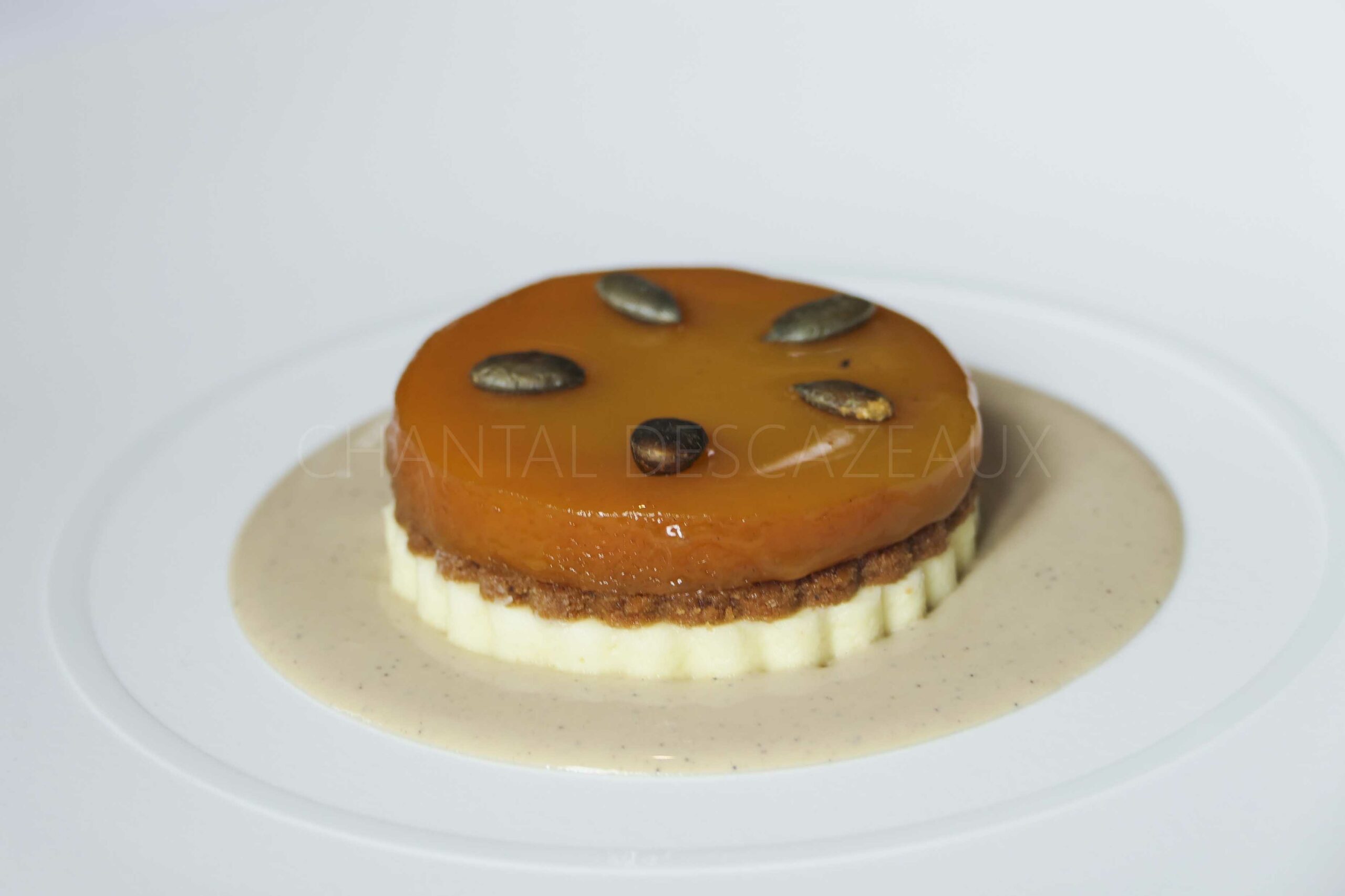 Courge au Café – Courge confite aux épices, sorbet orange/butternut, sauce crémeuse au café