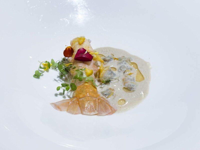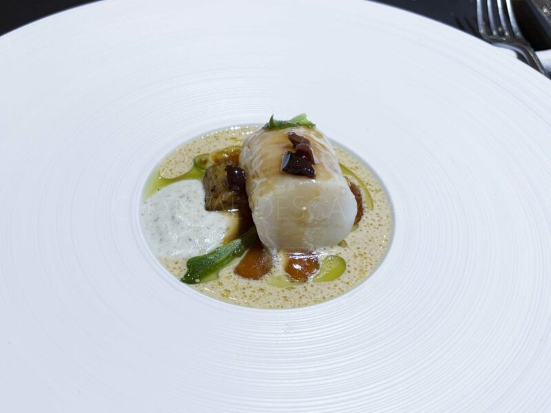 Sériole Ikejimé maturée par la Cheffe Oxana, crémeux de citronnelle, champignons crinière de lion cuite avec de la citronnelle en dessous, algues fumées, pleurotes jaunes au goût d’agrume, bouillon gingembre, citronnelle, katsobushi et une pluie pailletée de poutargue. Une assiette avec une belle intensité gustative, une finesse remarquable, une intensité saline et fumée, un dialogue entre le brut marin (ssériole, poutargue) et la complexité aromatique (bouillon thaï). Excellent.