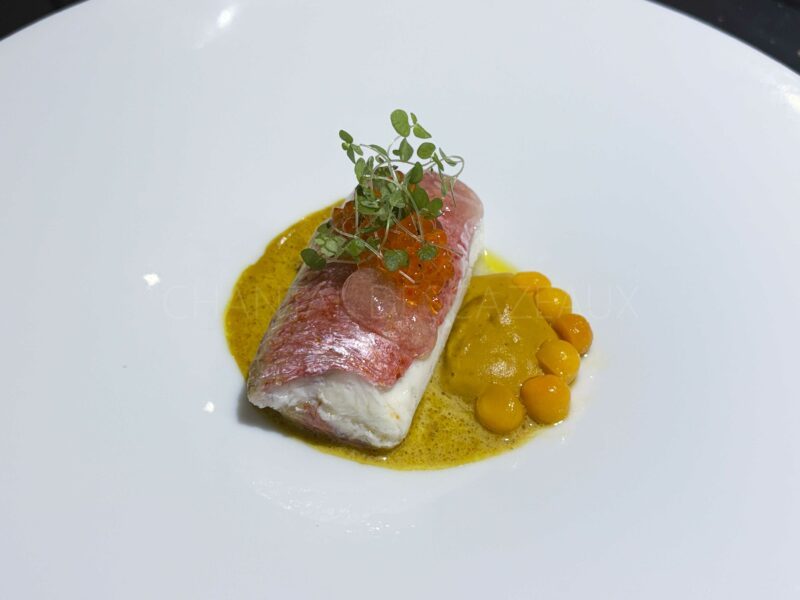 Superbe plat composé d’un rouget garni d’une farce de rouget, oeufs de truite sur le dessus, butternut et sauce à la Golden Milk (safran, curry, épices jaunes), gel de fleurs de sureau.