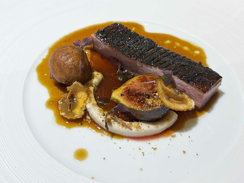 Cuisson bbq, figue caramélisée, pomme dauphine maison, cercle de pannacota au shiso, chips de châtaigne, réduction de jus de canette. Encore un plat totalement maitrisé, de la gourmandise, une combinaison qui allie la puissance de la canette avec la douceur fruitée de la figue et la fraîcheur aromatique et légèrement poivrée du shiso. Du goût et de la gourmandise, excellent.