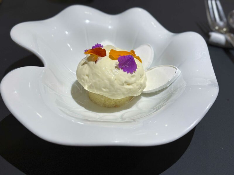 Le merlan est cuit à 56°, avec un côté très fondant et délicat à la dégustation. Crémeux hélantis, sauce Saké, kaffir et combava, gel de mimosa et d’huile de kalamata. Une magnifique combinaison de précision, d’équilibre et de saveurs. On sent l’énorme travail en amont, gros coup de coeur pour ce plat absolument parfait.