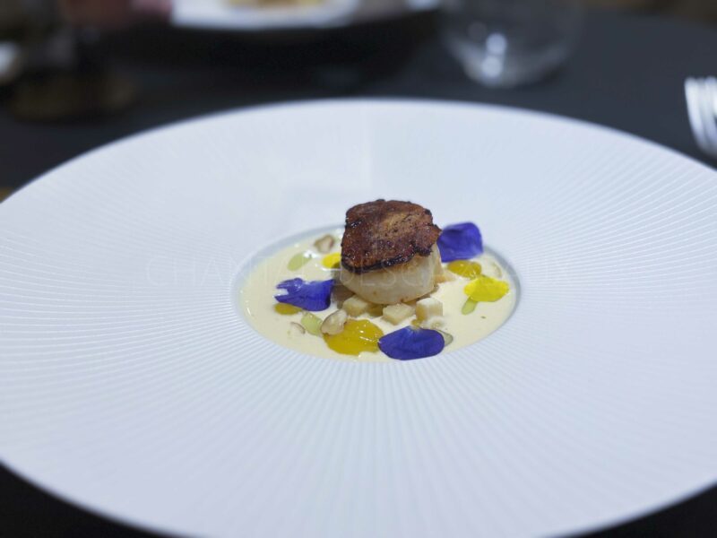 Langoustine que l’on retrouve en 2 déclinaisons, en tartare et snackée, accompagnée d’une bisque lavande et safran. Des saveurs fleurs d’oranger et citronnelle, quelques coques, un ensemble qui a du peps, toujours une belle élégance dans les saveurs, excellent.